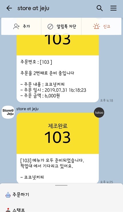 음료가 모두 준비되면 카톡이 오고
