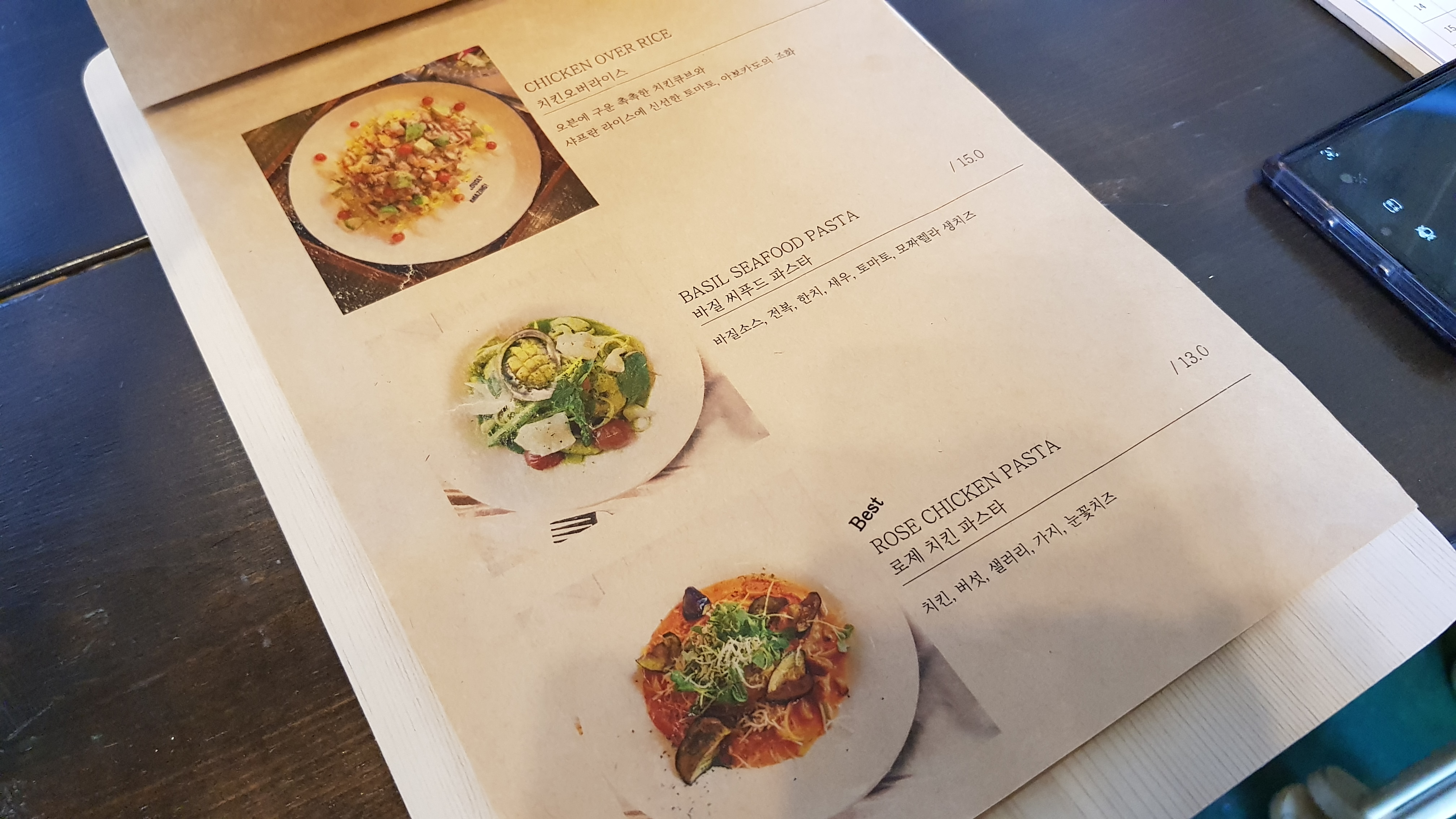 치킨 오버라이스, 바질 씨푸드 파스타, 로제 치킨 파스타 가격은 13000원에서 15000원대이다.