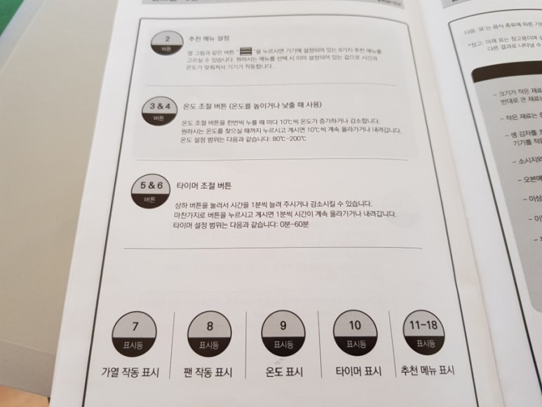 메뉴와 온도 및 시간이 자세히 적혀있다.
