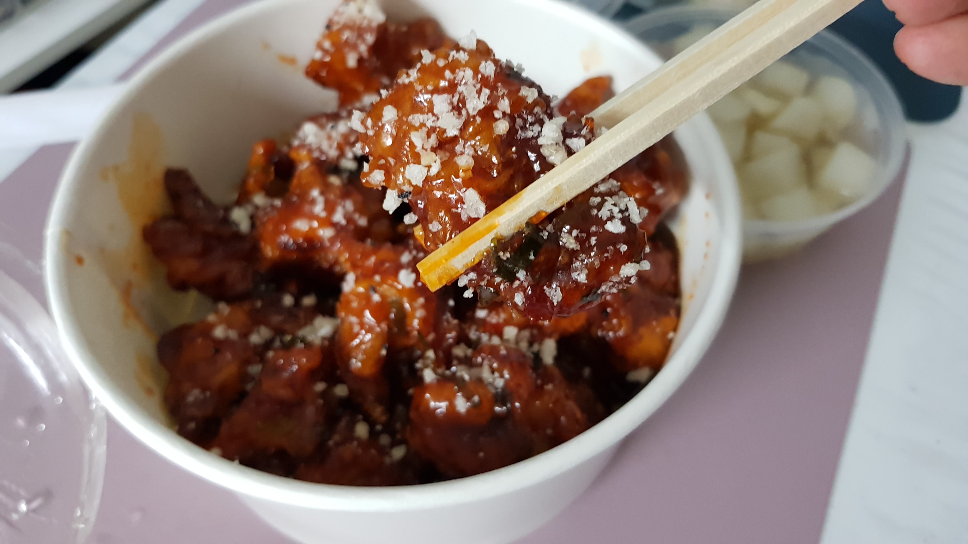 계속 먹다보니 매운 화산닭강정을 주문할걸하고