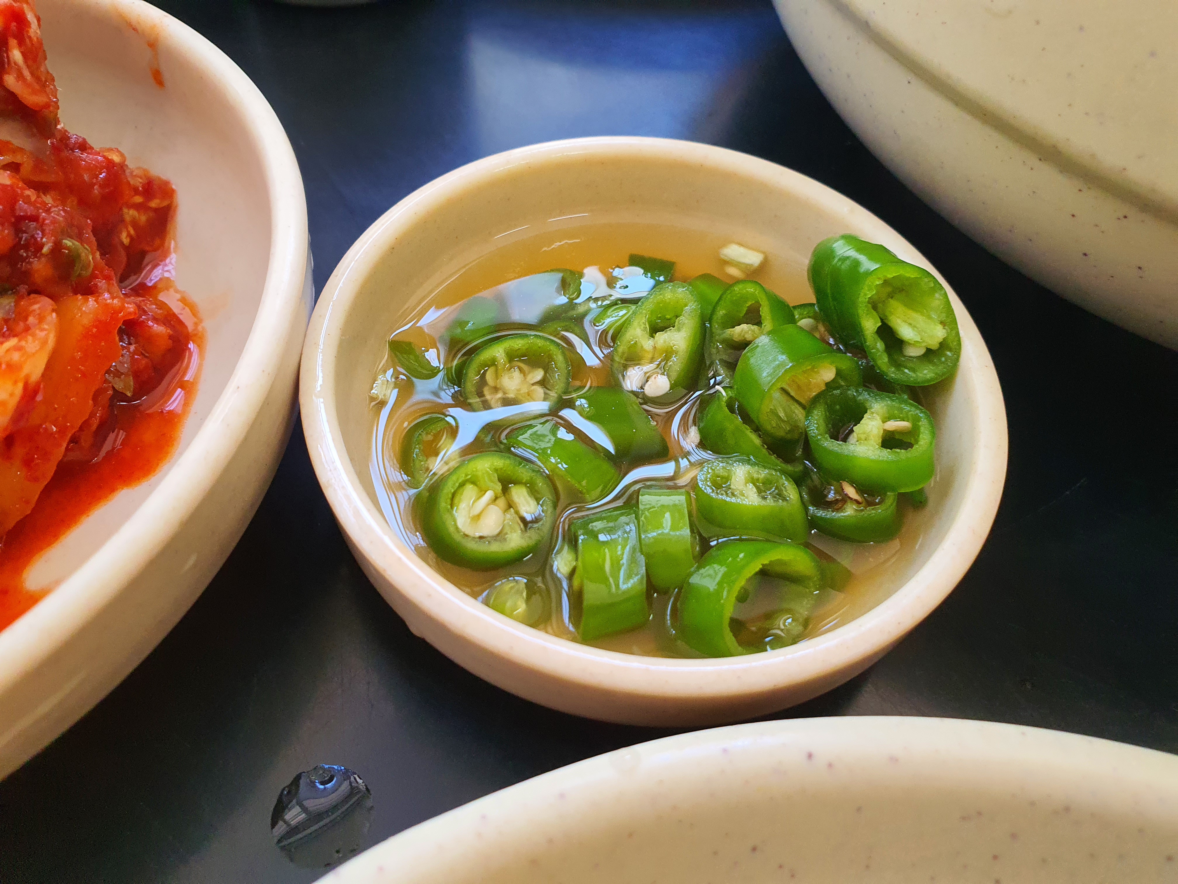 국물이 곰탕 색과 비슷한데, 간장과 고추가