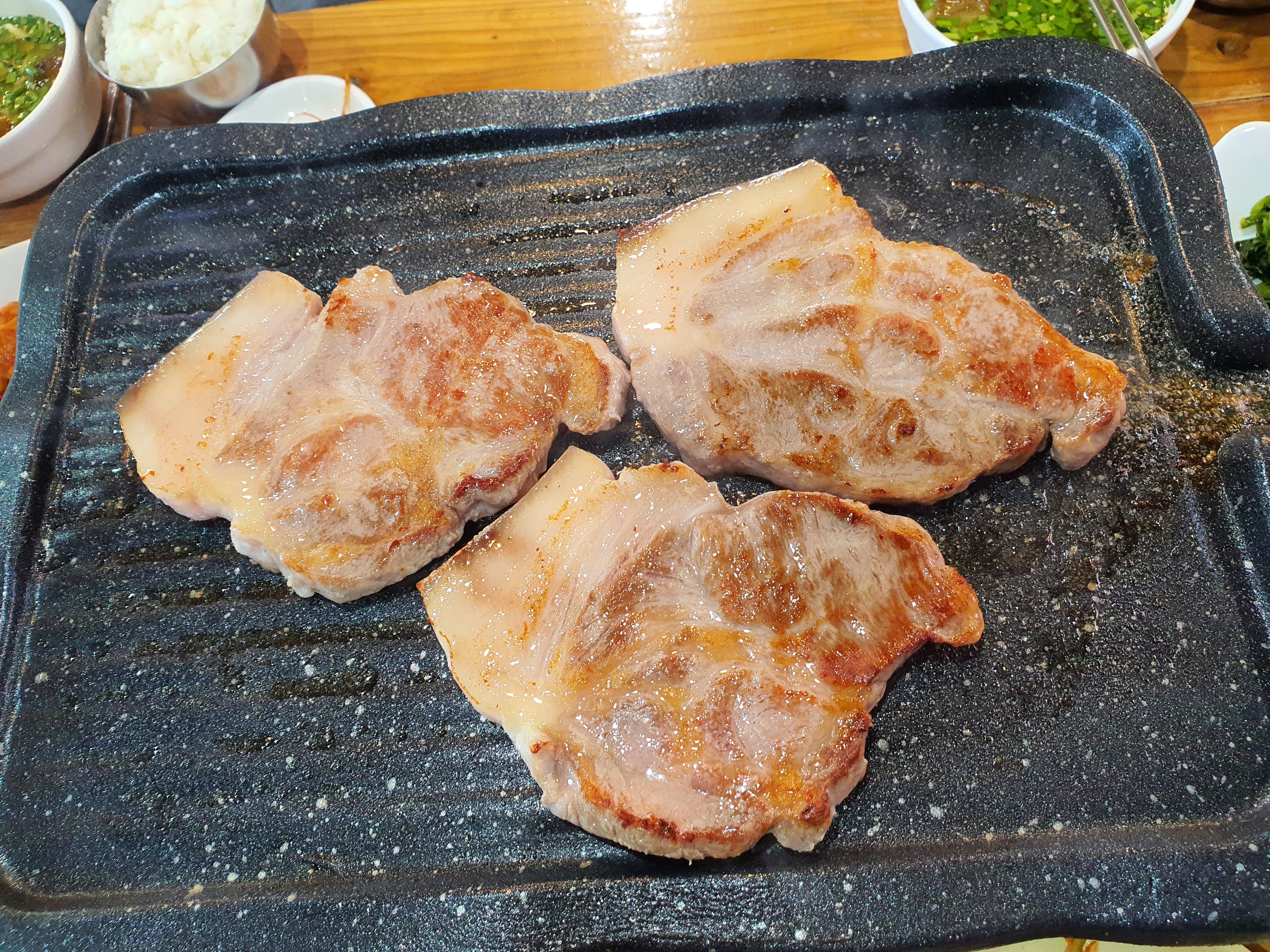 불판에 노릇하게 구워진 짠내투어 제주 맛집의 목살!