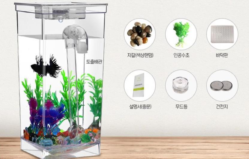 베타 수조 어항세트에는 자갈, 인공수초, 바닥판, 무드등, 건정지가 함께 온다.