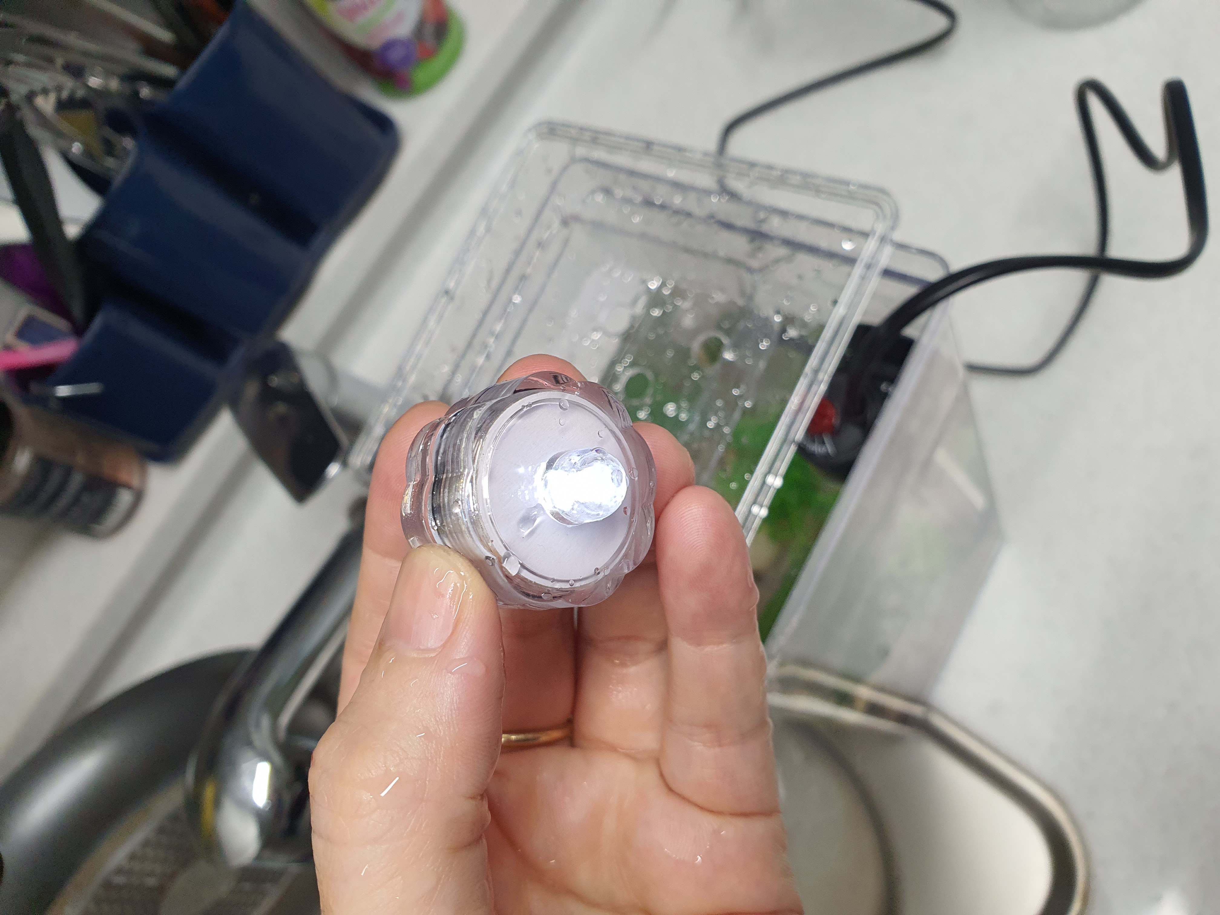 그리고 베타 어항 세트에는 LED 전구가 들어있다. 안에는 동그란 건전지가 들어있고 오른쪽 왼쪽으로 돌리며 켰다 꼈다 할 수 있다.