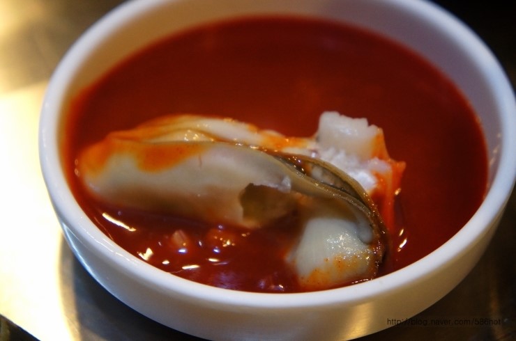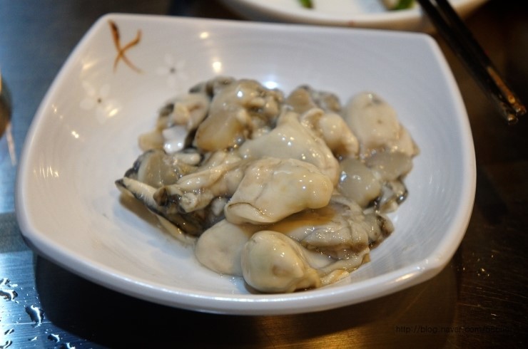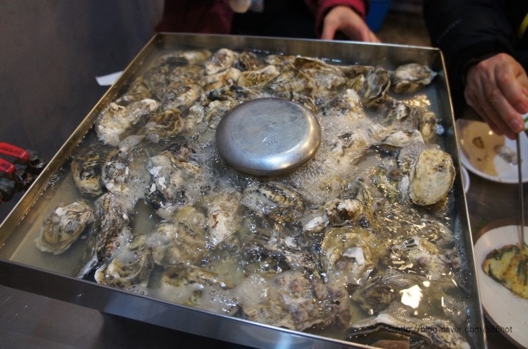 인원에 따라 중짜리와 대짜리를 주문할 수 있다. 이렇게 생굴을 바로 찜처럼 쪄서 먹는데, 매우 싱싱하고 맛있다.