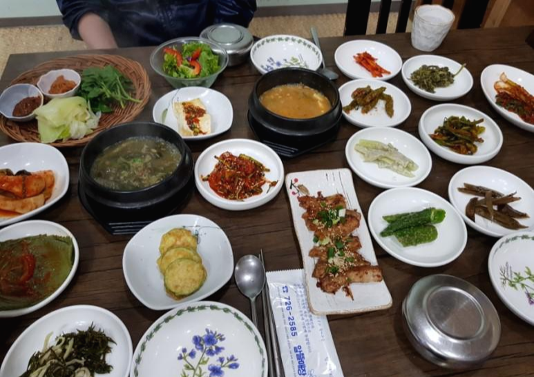 산들네 정식에는 14가지 이상 반찬이 나오고, 시래기 된장국, 청국장, 가자미 등 인원수에 맞춰 반찬갯수가 나온다.
