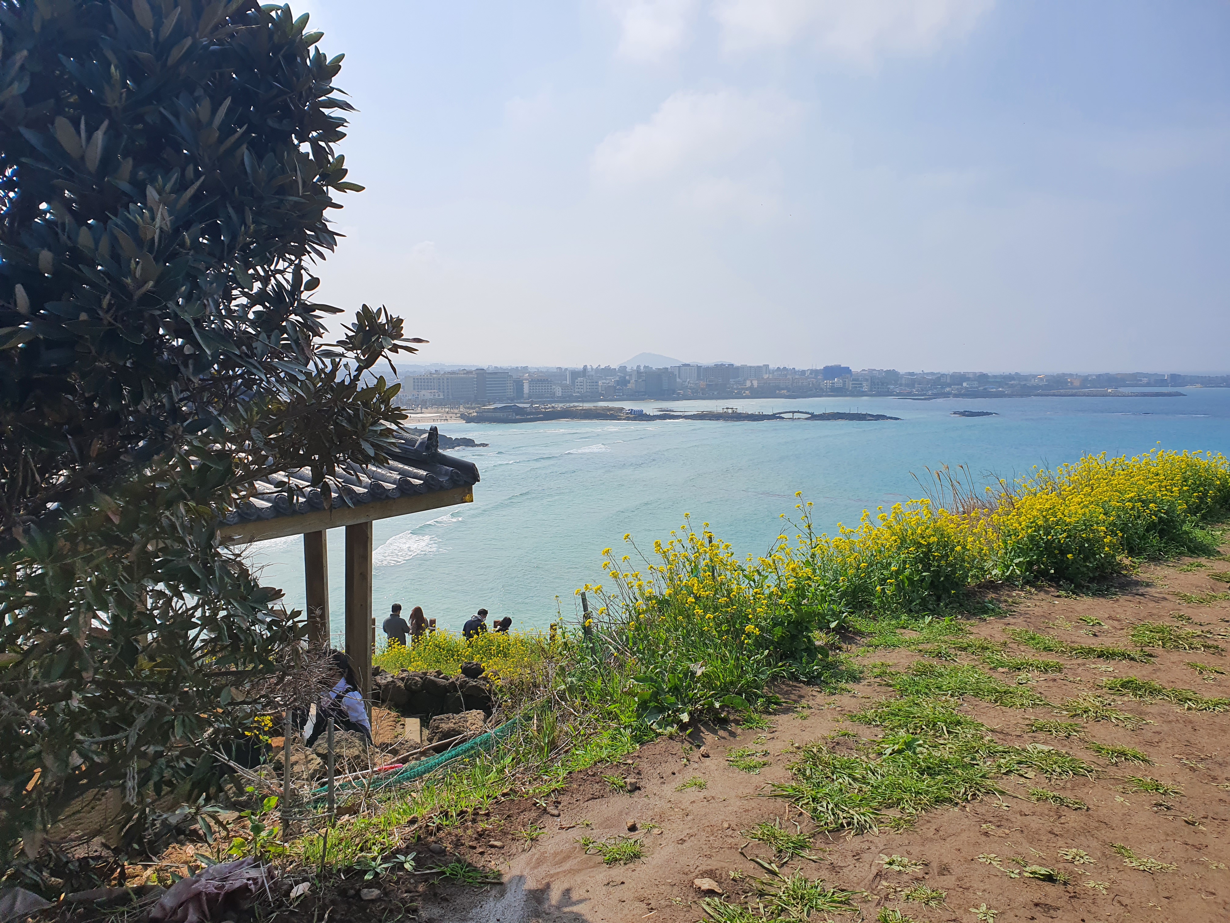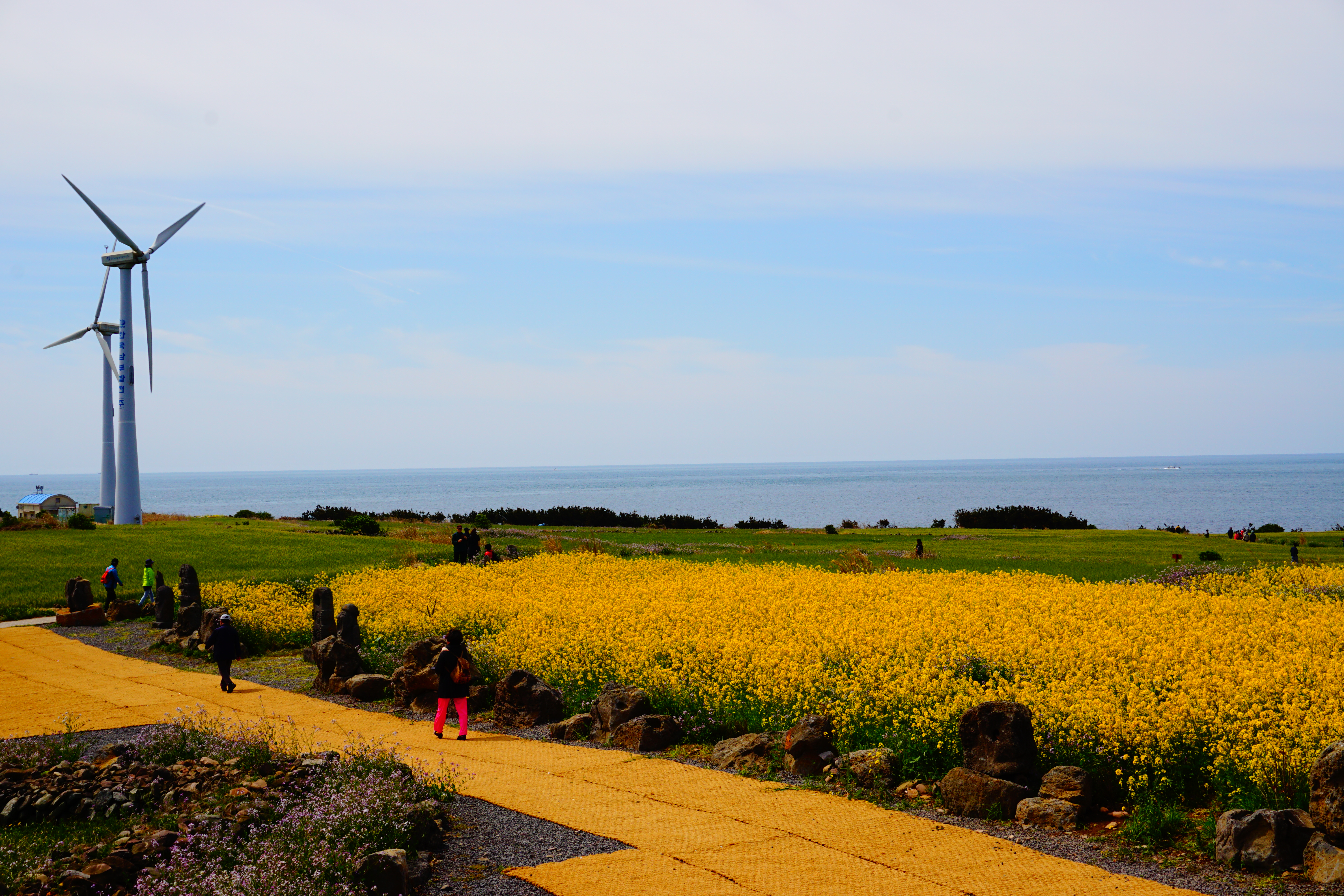 곳곳에 사람들이 멋진 바다를 배경으로 유채꽃 사진을 많이 찍고 있다.