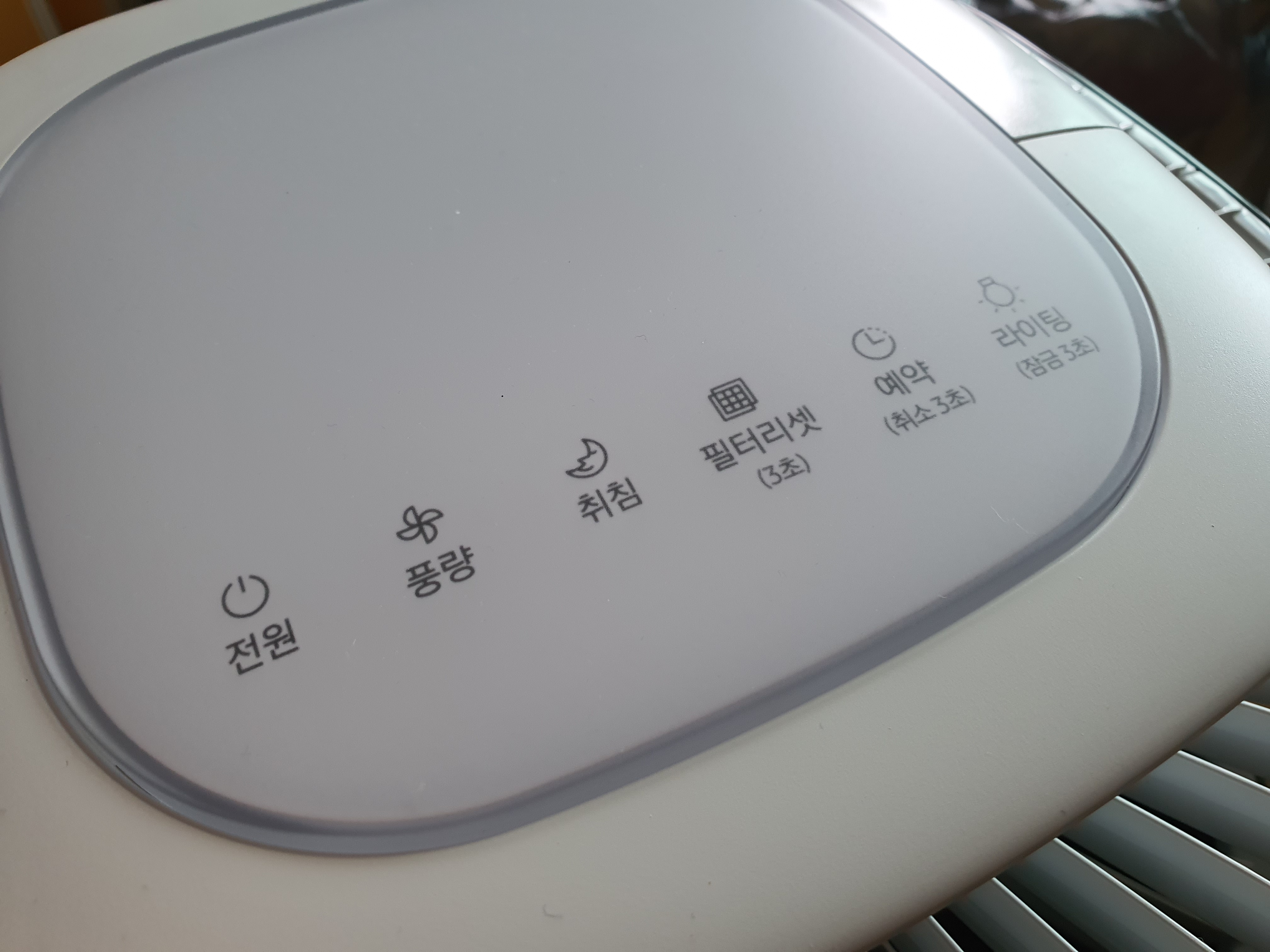 전원, 풍량, 취침, 필터리셋, 예약, 라이팅 버튼이 있고, 필터리셋은 새로 필터를 간 후 누르면되고, 라이팅은 밤에 어두울때 누르면 불이 들어온다.