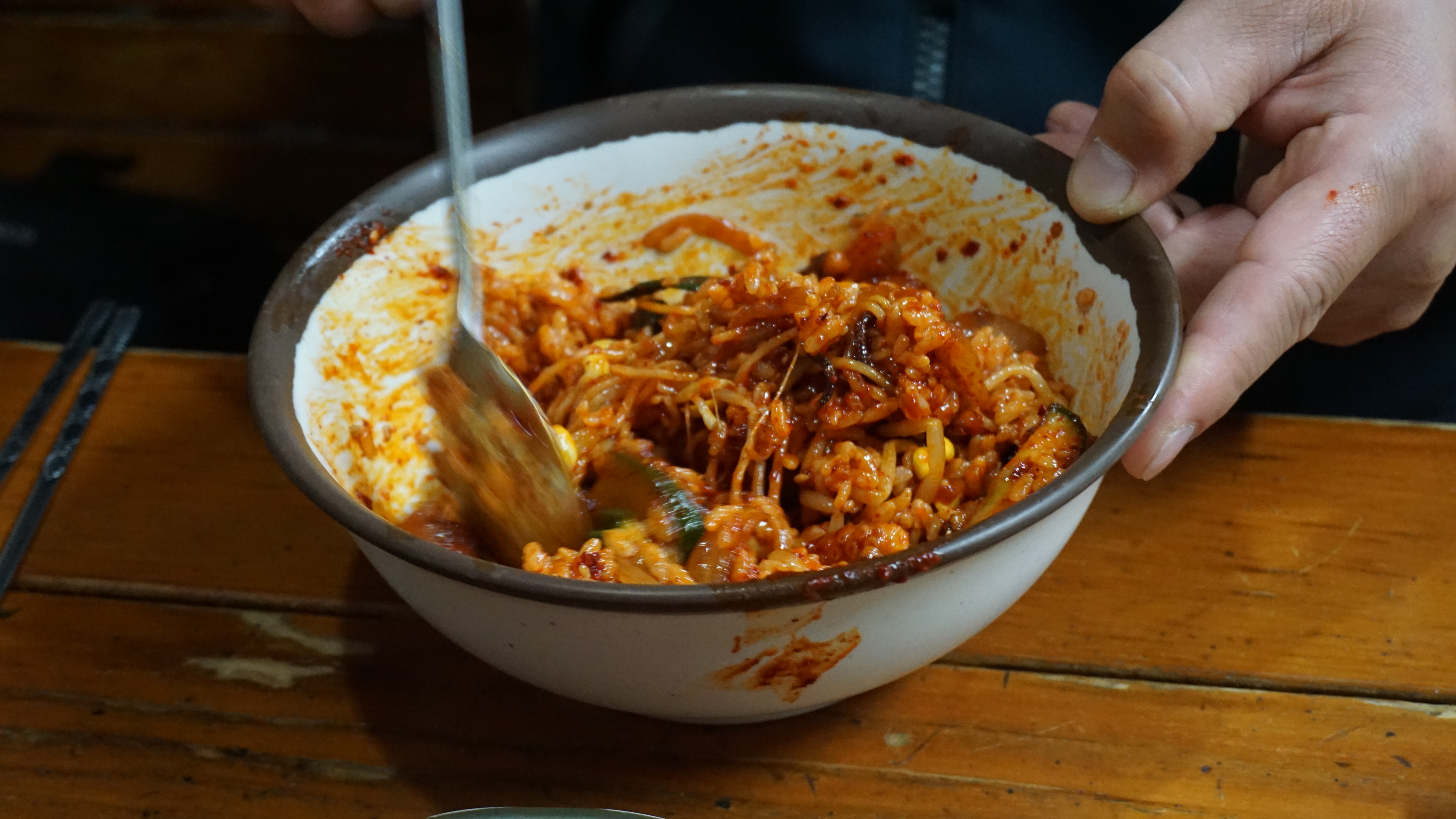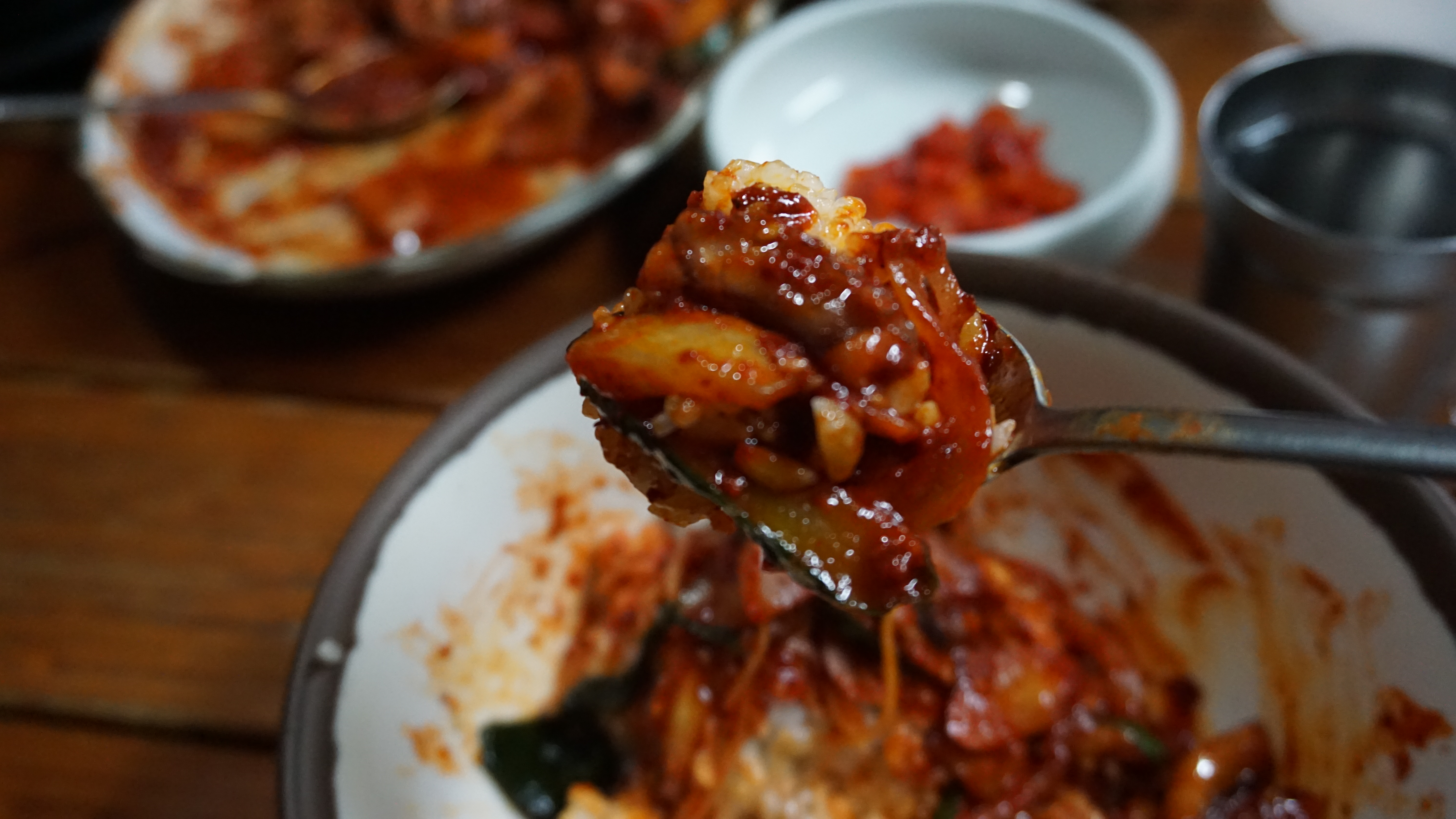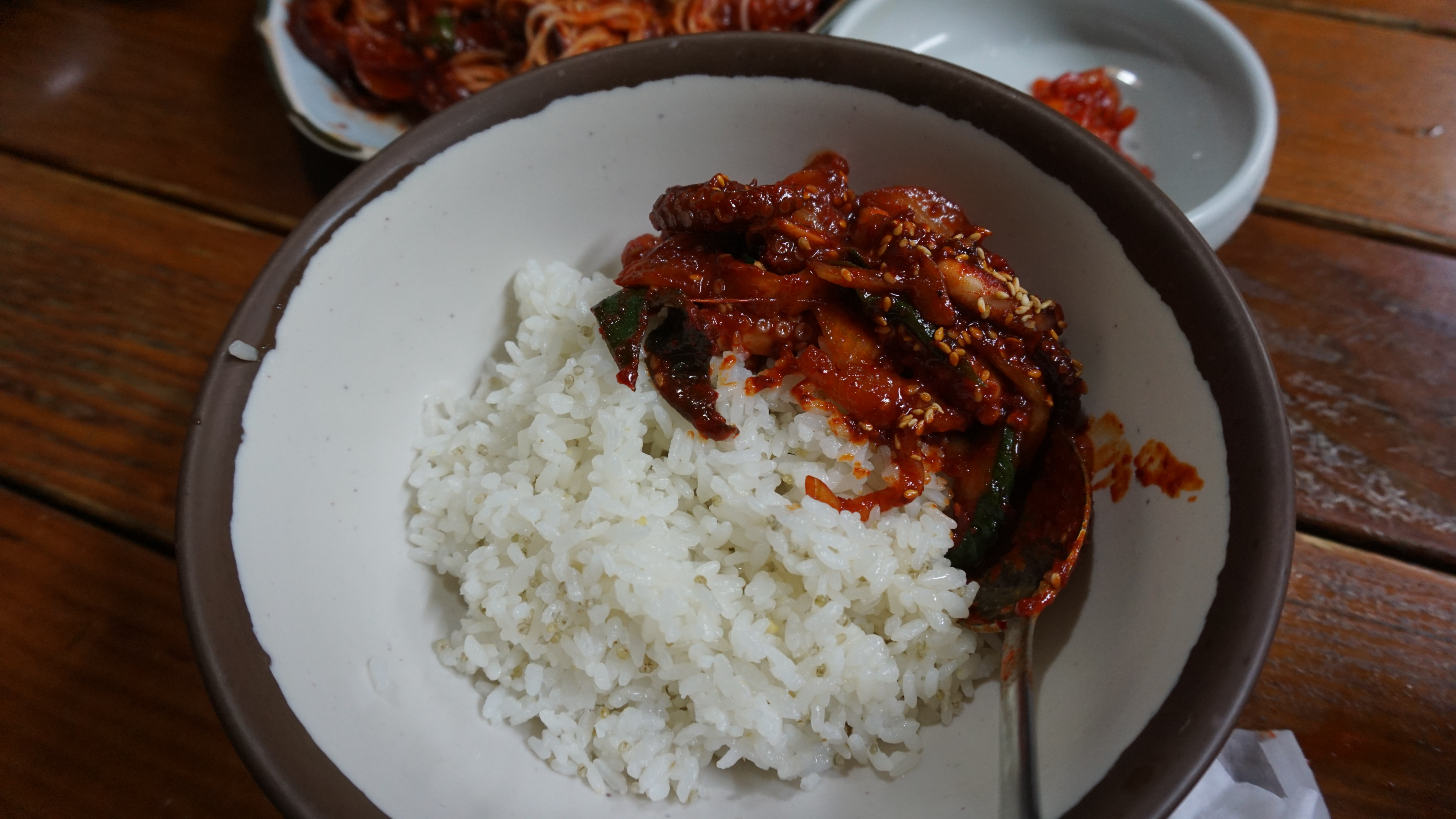 어느 정도 낙지볶음의 맛을 보면 밥위에 낙지랑 콩나물을 올리고 함께 비벼먹는것이 제주도 국룰이다.
