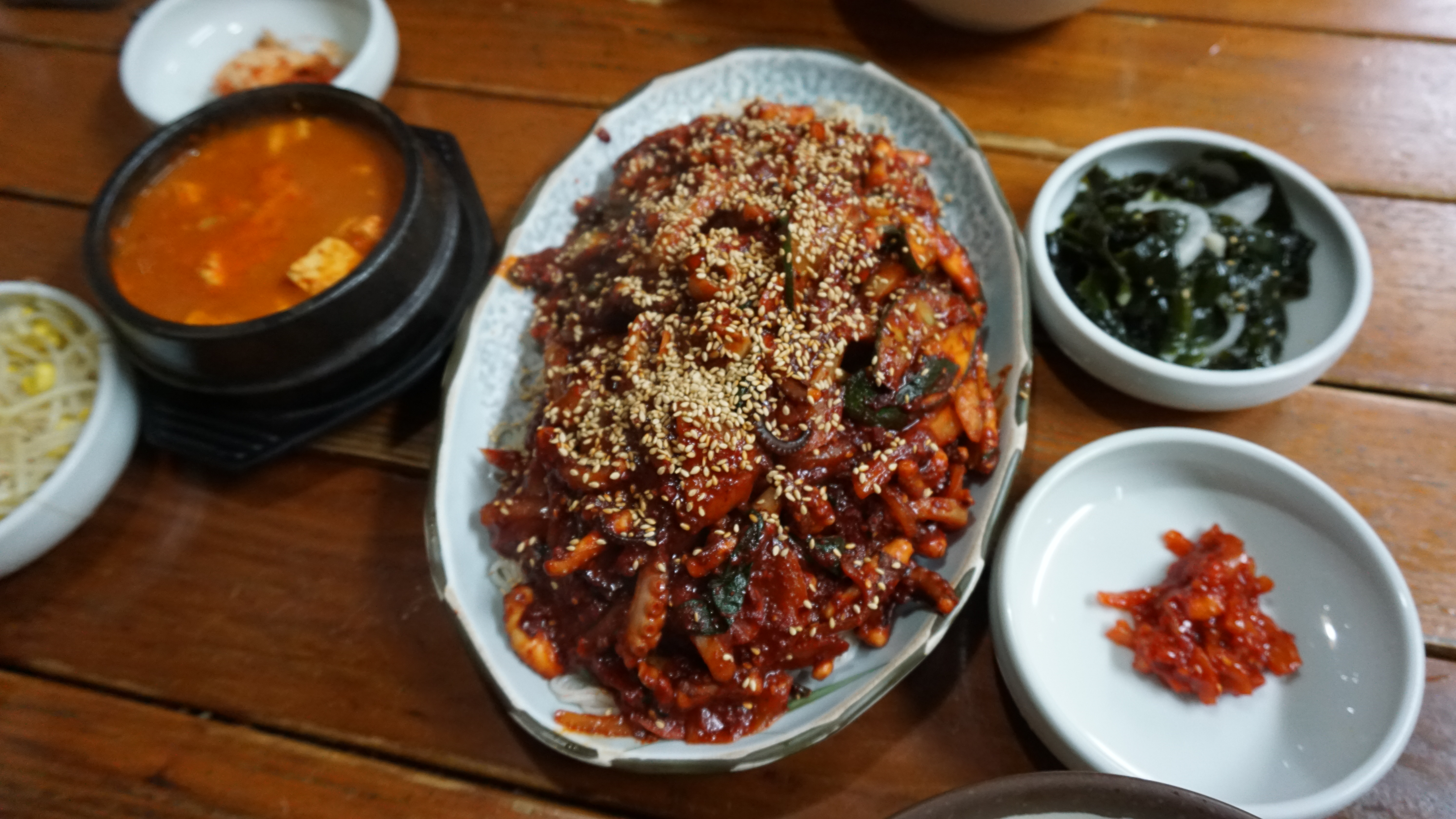 뜨거운 청국장과 매콤한 낙지볶음의 콜라보로 땀이 비오듯이 쏟아지는 굉장한 맛집이다.