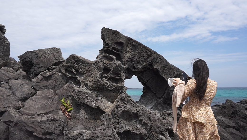 창꼼 바위는 자연으로 만들어진 굉장히 특이한 바위이다. 가운데 이렇게 구멍이 뚫려 있는데, 이곳이 제주 사진 명소로 핫하게 떠오르게 되었다.