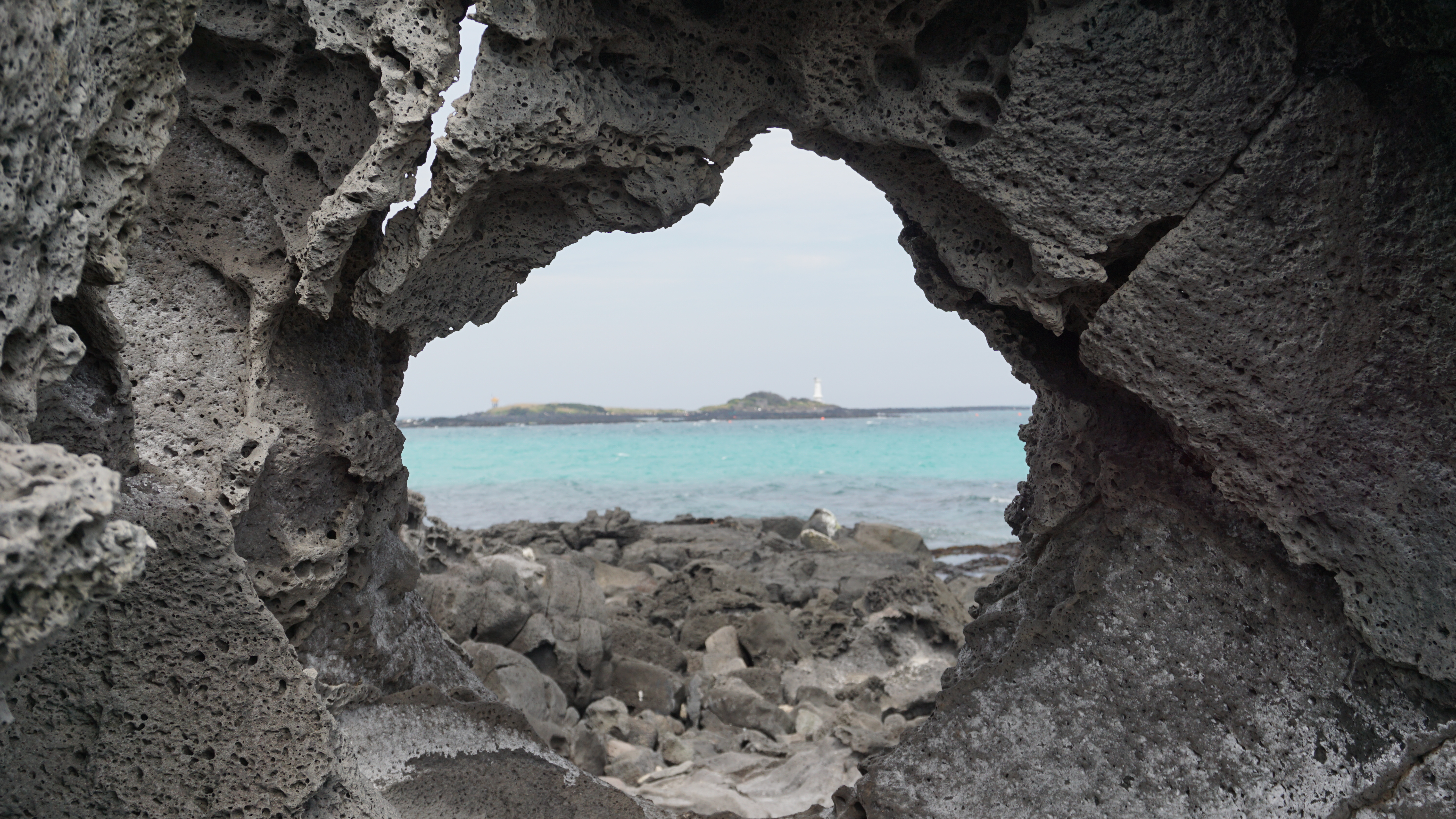구멍 반대편으로는 작은 섬 다려도가 보이고, 이곳에 서서 많은 사람들이 사진을 찍으며 추억을 만들고 있다.