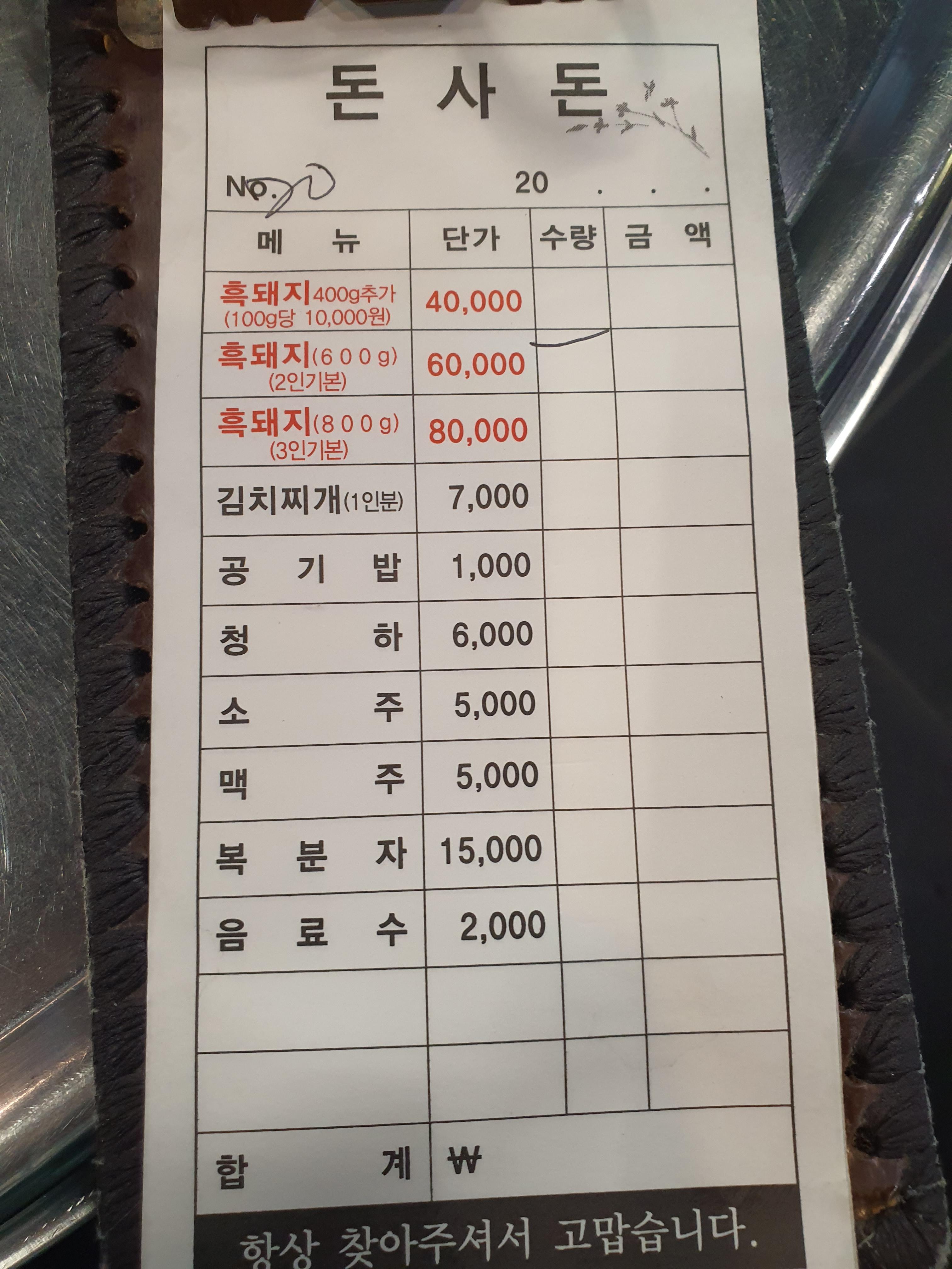 2인 기준이면 600g 6만원 흑돼지를 먹으면 된다.