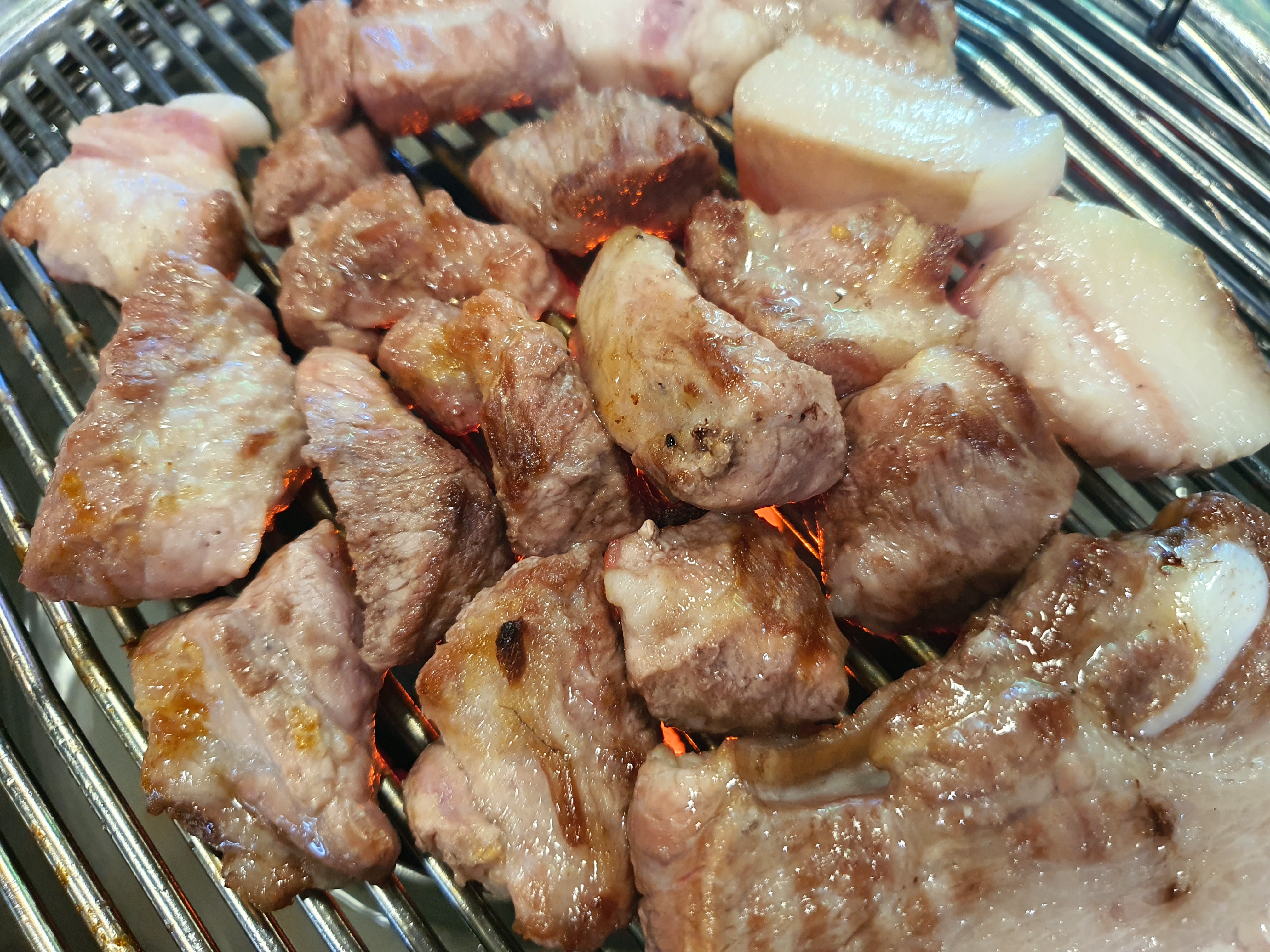 연탄불에 제주 흑돼지 맛집의 육즙가득한 고기가 잘 구워졌고, 한입 크기로 잘려 있어 먹기 매우 좋다.