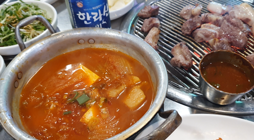제주 흑돼지 맛집 돈사돈에서는 김치찌개도 빼놓을 수 없다. 인기가 좋고, 고기와 매우 잘 어울리는 맛이다.