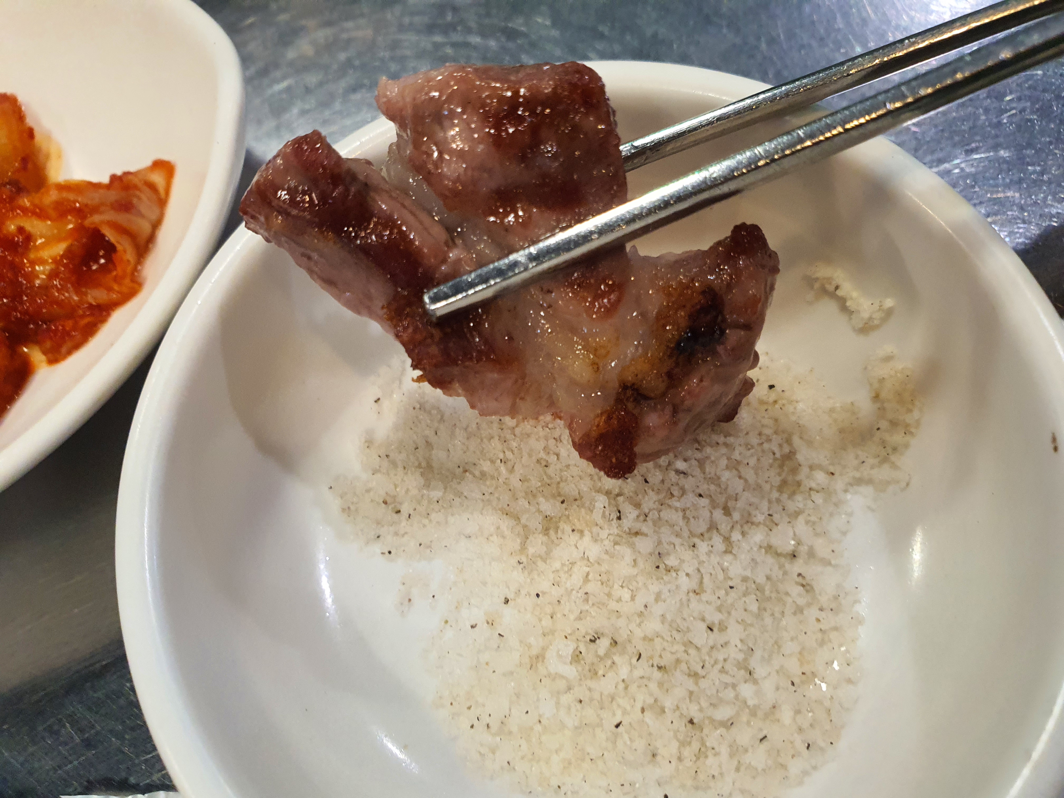 첫입은 그냥 소금에만 찍어서 먹어보기, 확실히 다른 백돼지나 삼겹살 보다 제주 흑돼지가 더욱 고소하고 기름까지 맛있다.