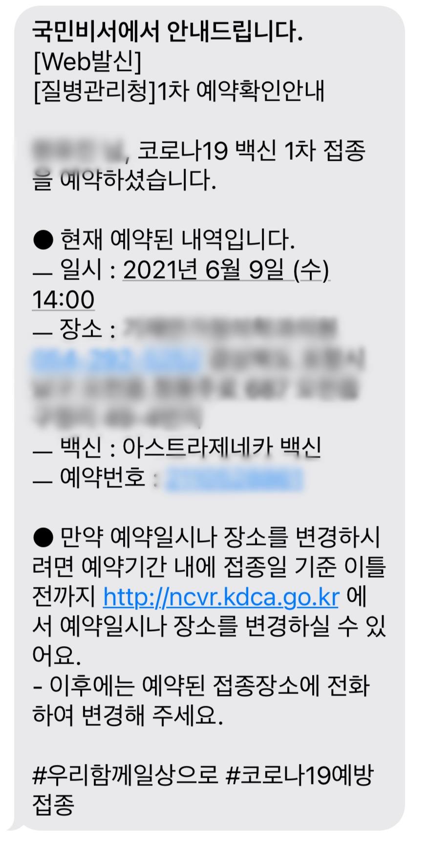 1차 코로나 잔여백신 예약이 완료 되면 이렇게 문자 메시지로 확인 문자가 온다.