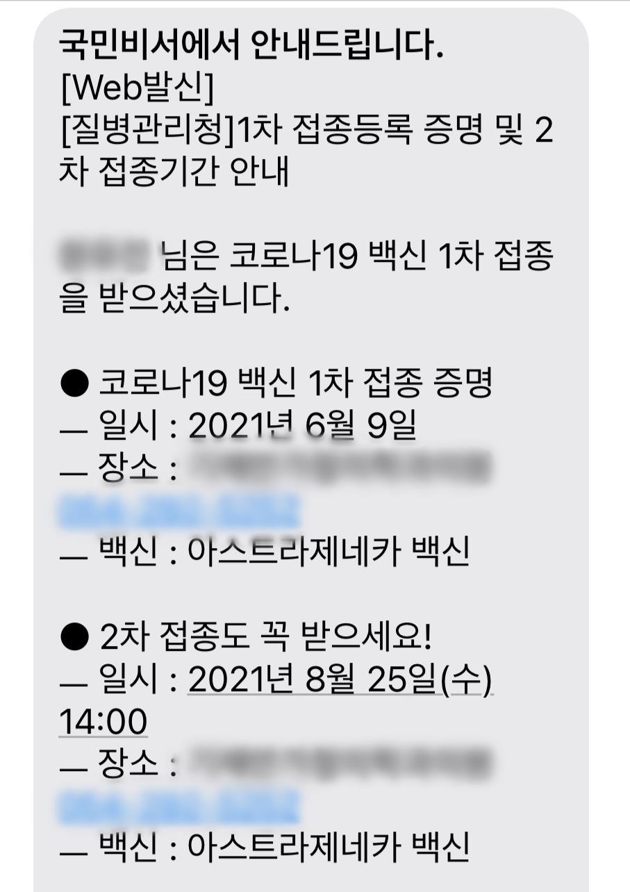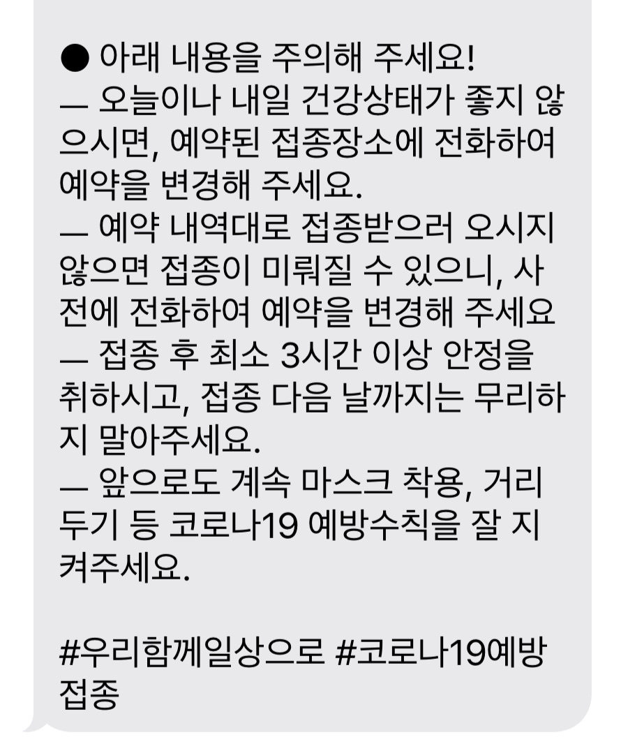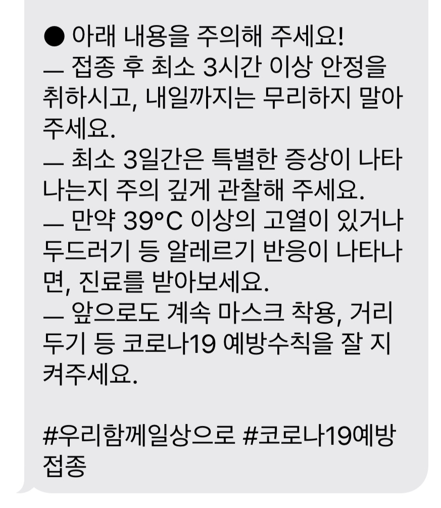 접종 후 3시간 정도는 무리하지 말라는 내용과 열은 오를 수 있으나 39도가 넘어가면 진료를 받아보라는 것 같은 권고사항이 담긴 문자도 같이 온다.