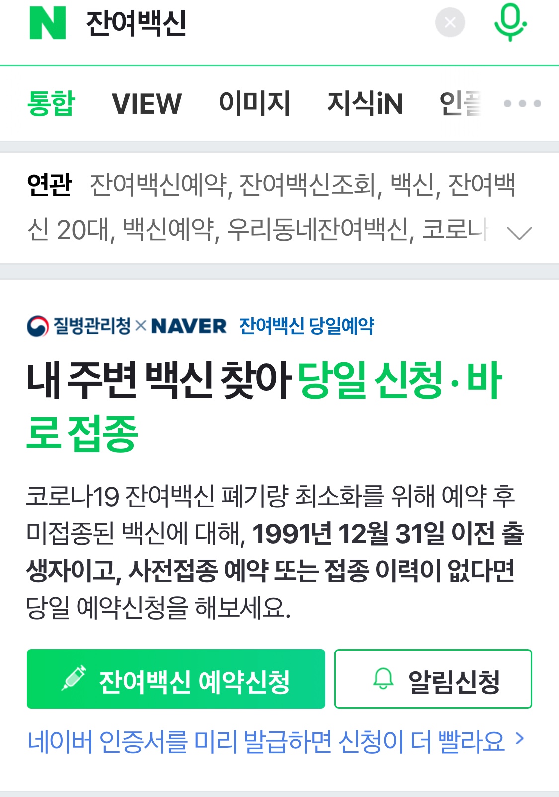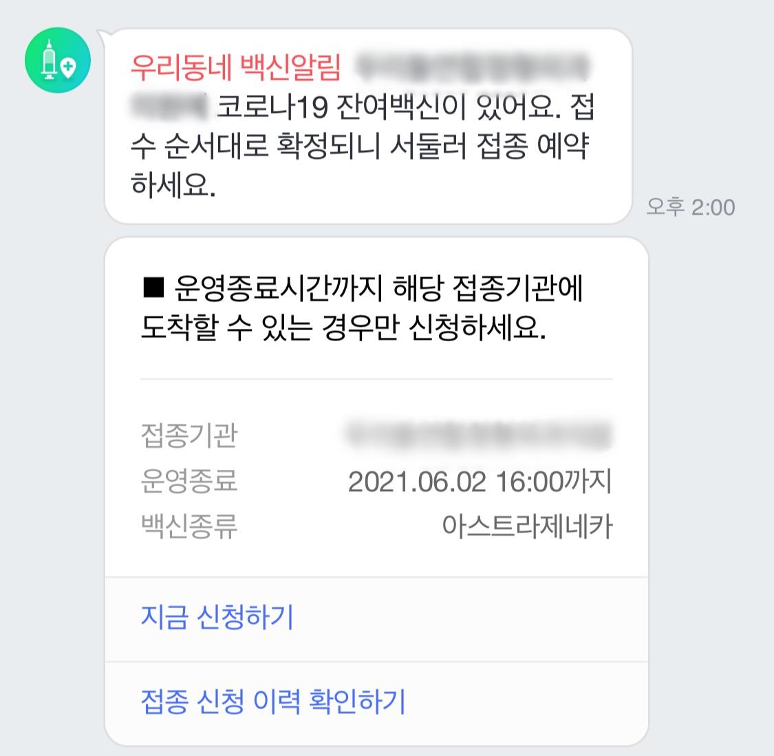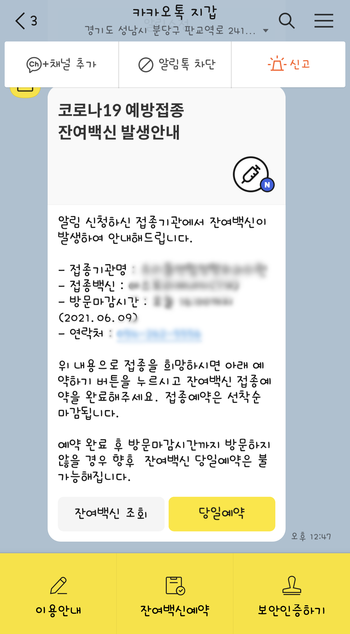 운이 좋게도 네이버 잔여백신 알림과, 카카오 잔여백신 알림이 모두 울려 바로 코로나 잔여백신 예약을 했다.