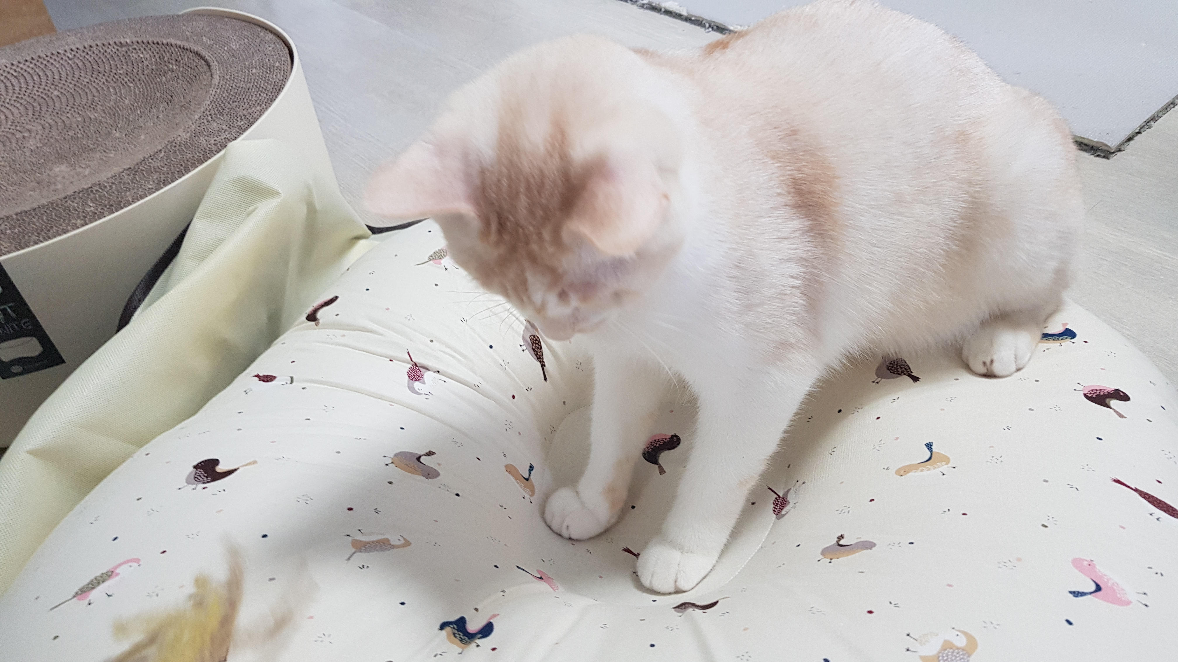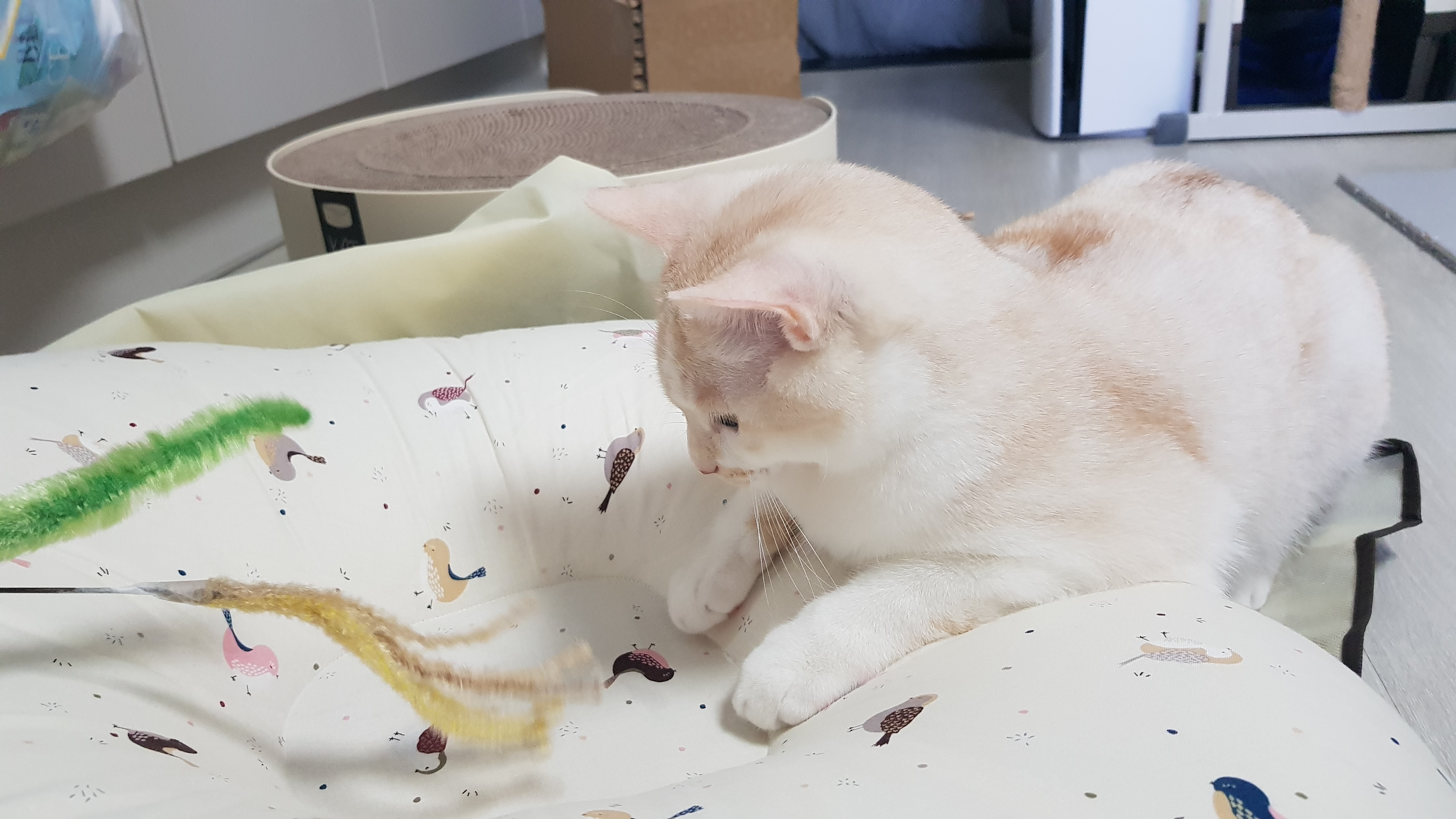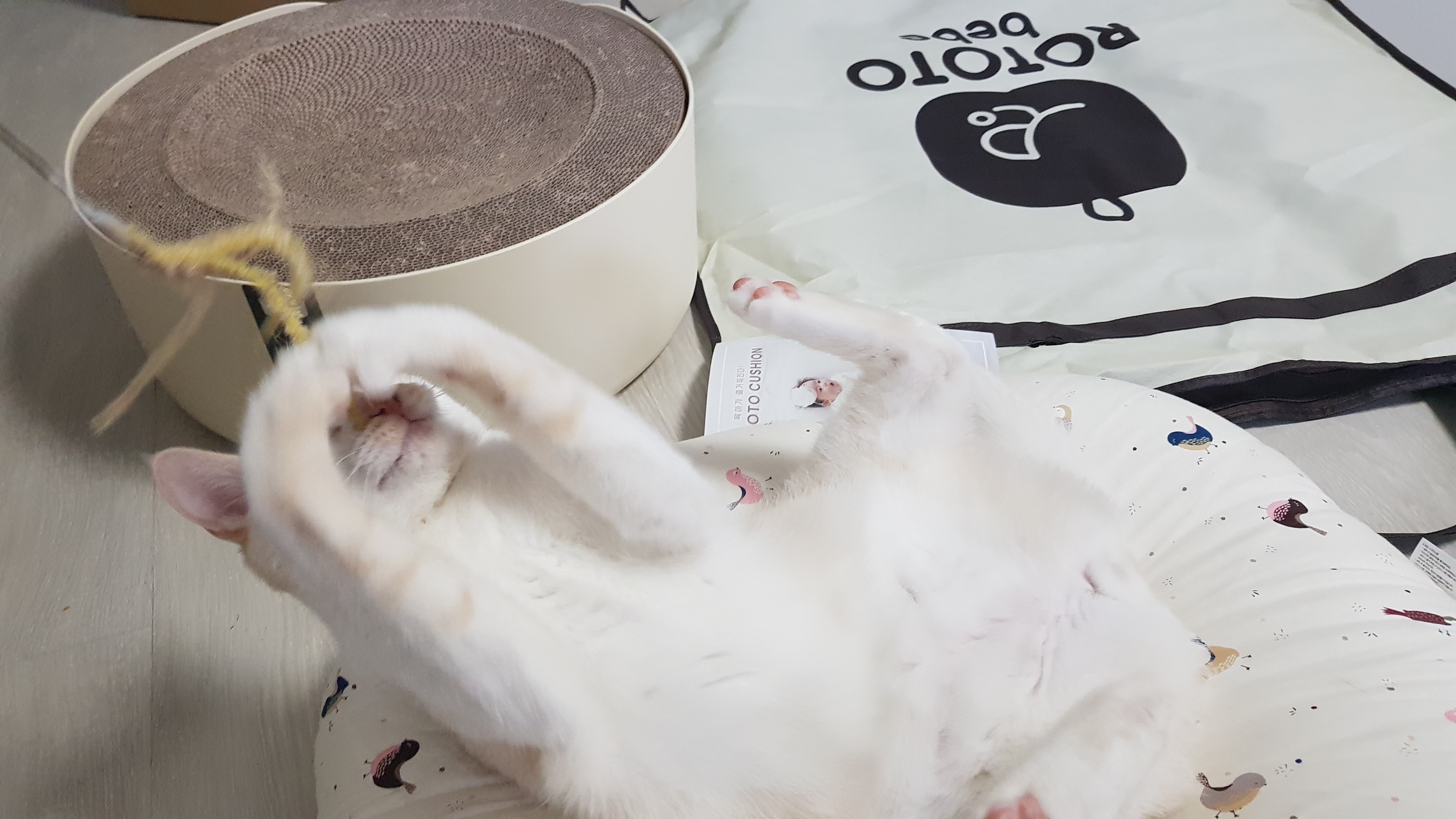 폭신한 역류방지 쿠션과 장난감까지 완전 행복한 고양이 모습이다.