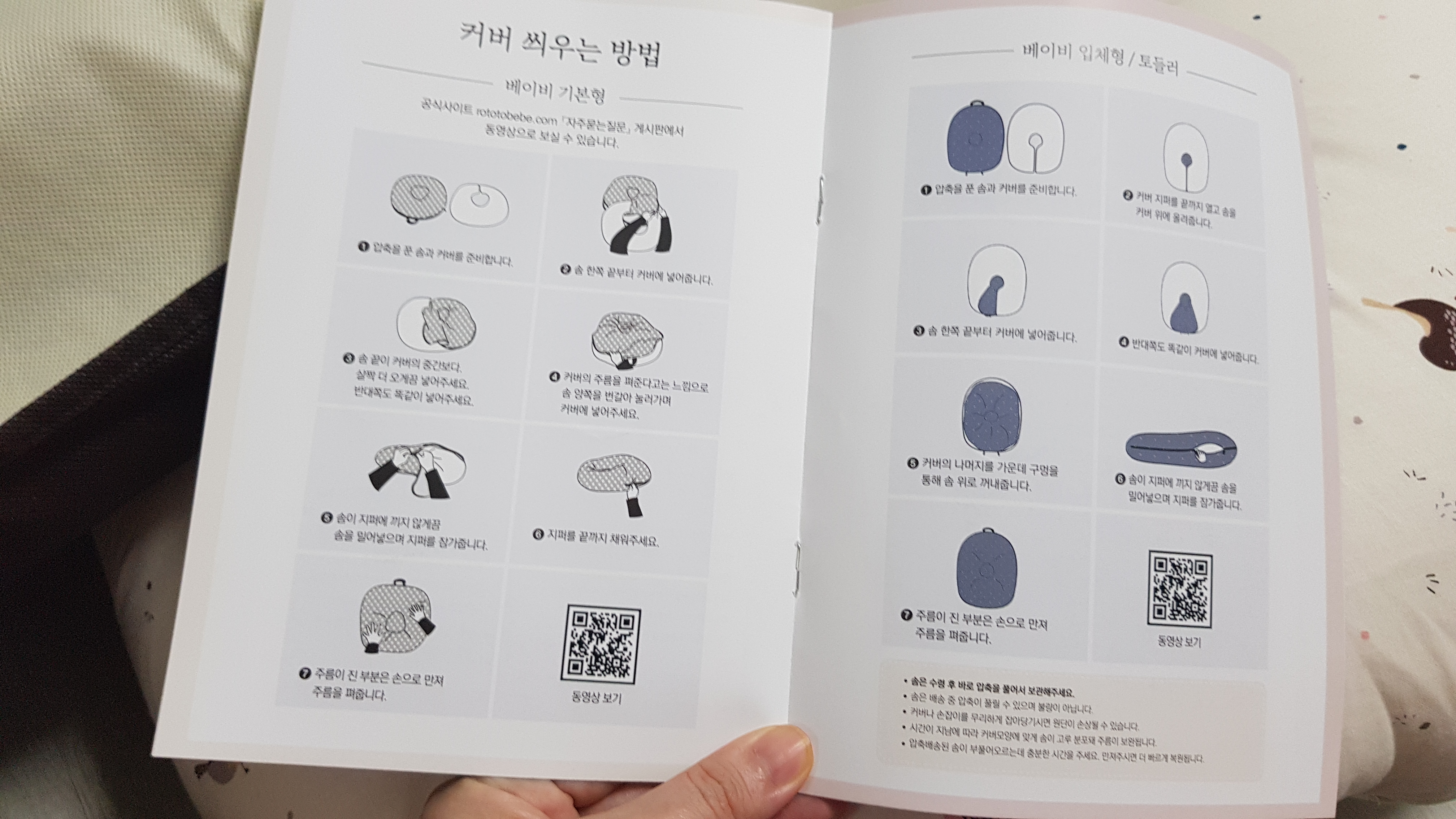 역류방지 쿠션 설명서에는 커버 씌우는 방법이 나와있고, 커버를 빨고 씌우는 방법은 생각보다 어렵지 않다.