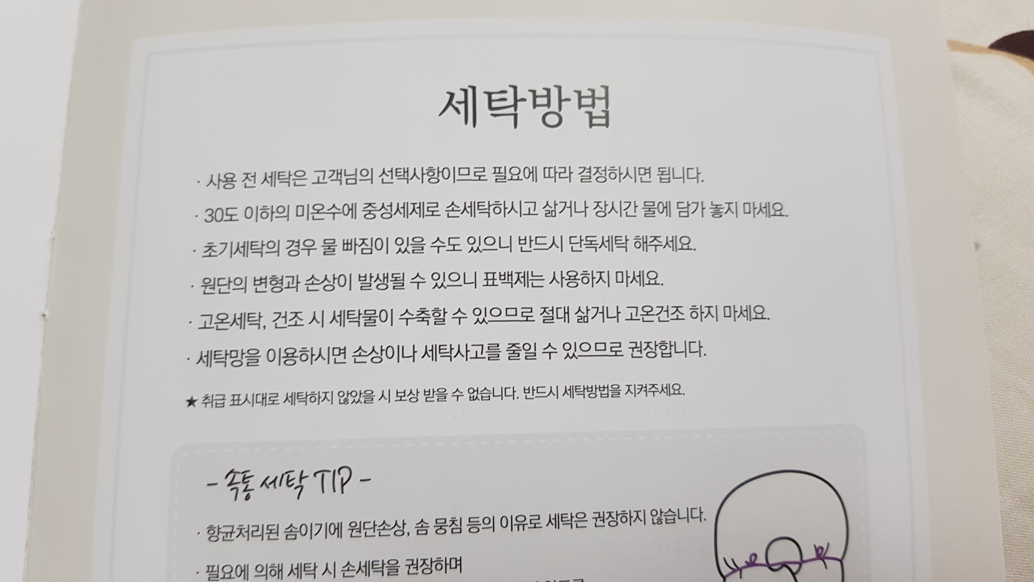 초기 세탁에는 물빠짐이 있을 수 있어서 다른 빨래와 함께 빨지말라고 적혀있다.