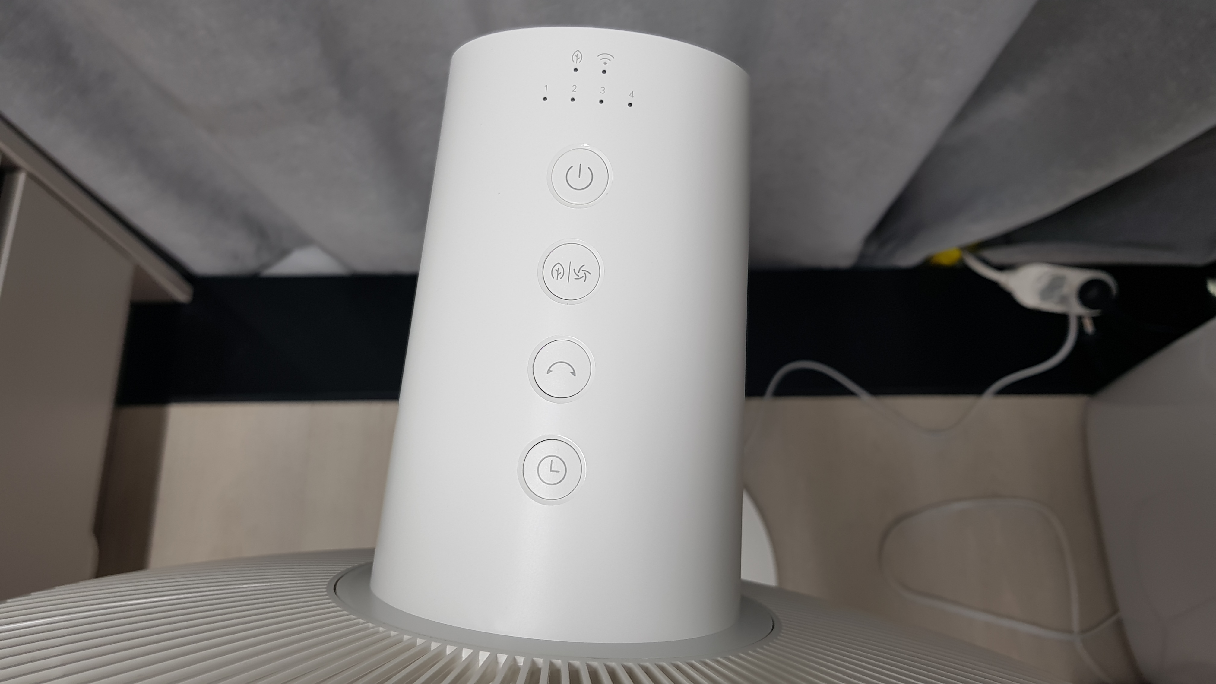 첫번째 전원버튼. 두번째 버튼 풍량세기. 세번째 버튼 회전. 네번째 버튼예약 기능이다.