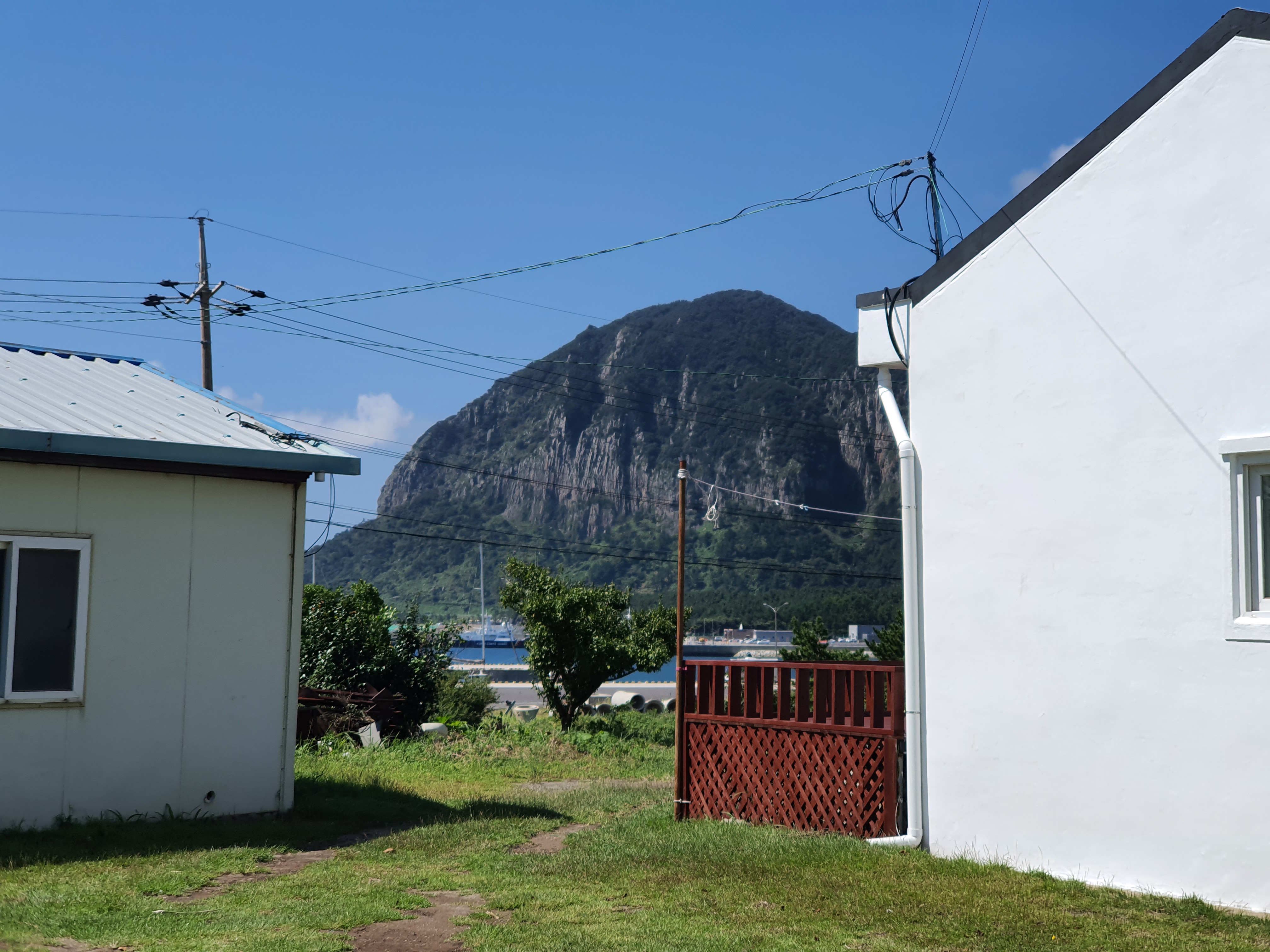화순한가네식당에 들어가기 전 건물 바로 옆에서 멋진 산방산의 모습이 보인다.