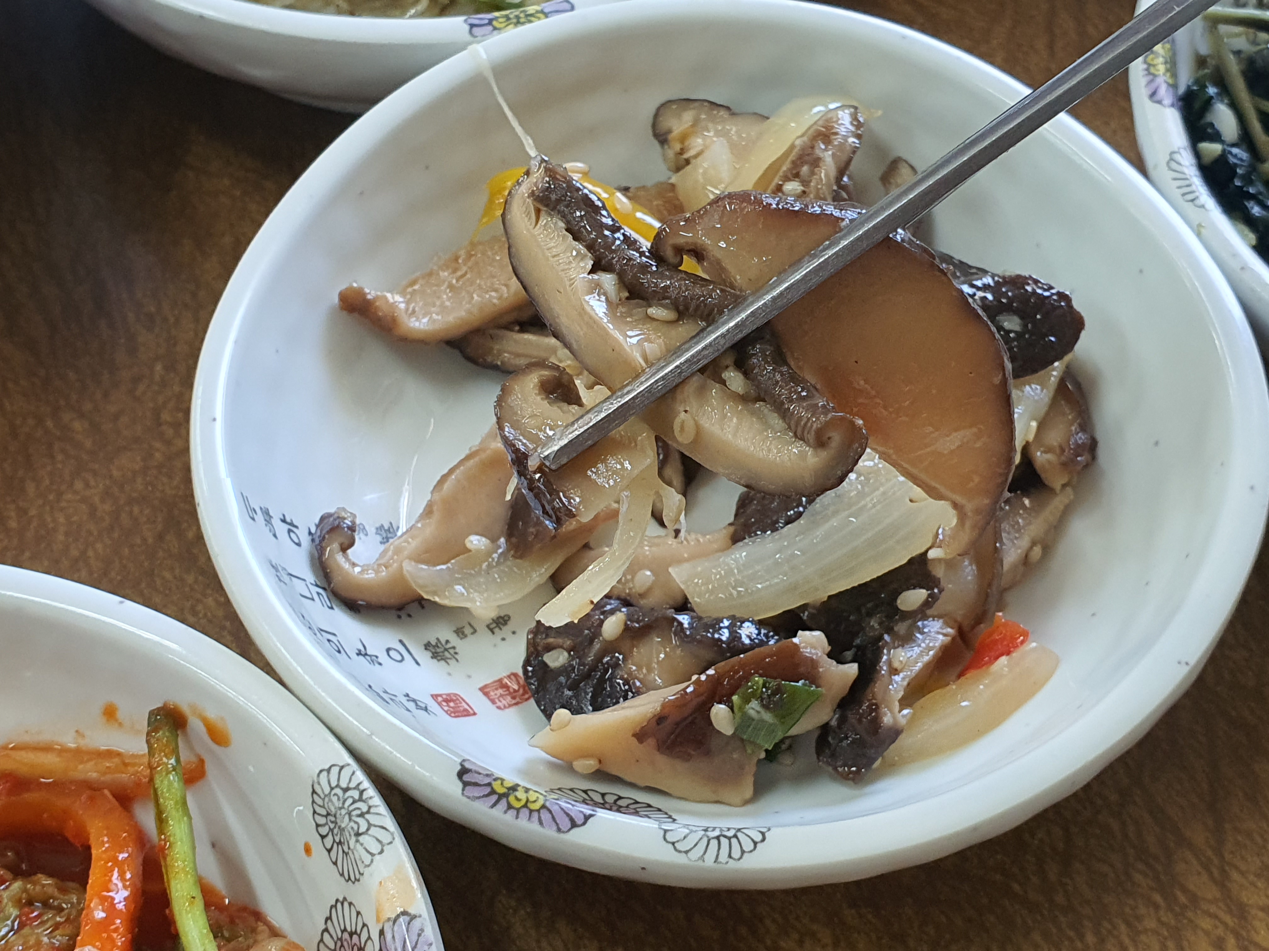 버섯, 김치, 장조림, 미역무침, 감자조림, 멸치볶음 등 다양한 반찬들이 한 가득 나온다.