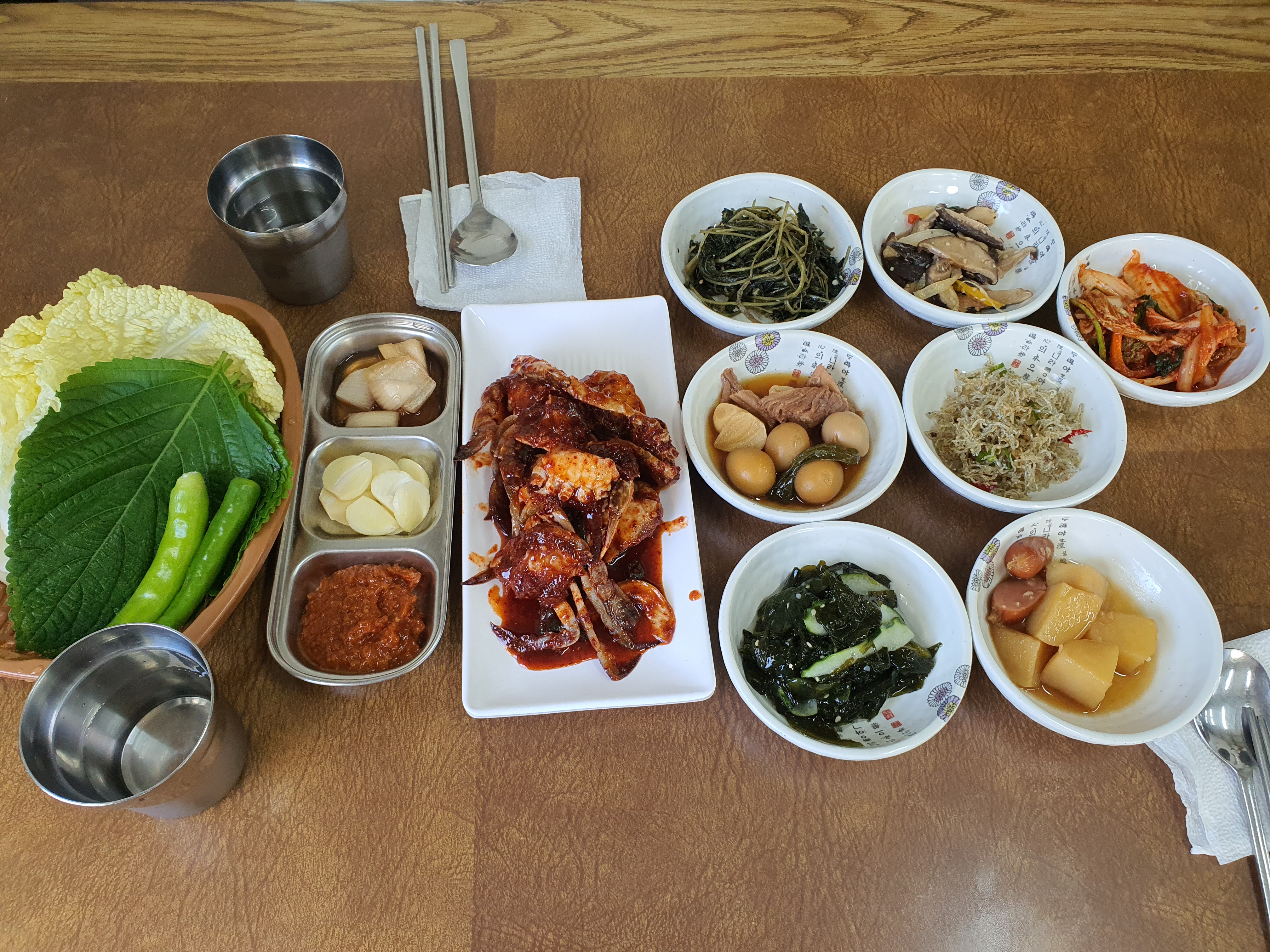 7가지 정도의 반찬과, 메인메뉴로 튀김 돔베고기를 주문하면 양념게장도 함께 나온다.