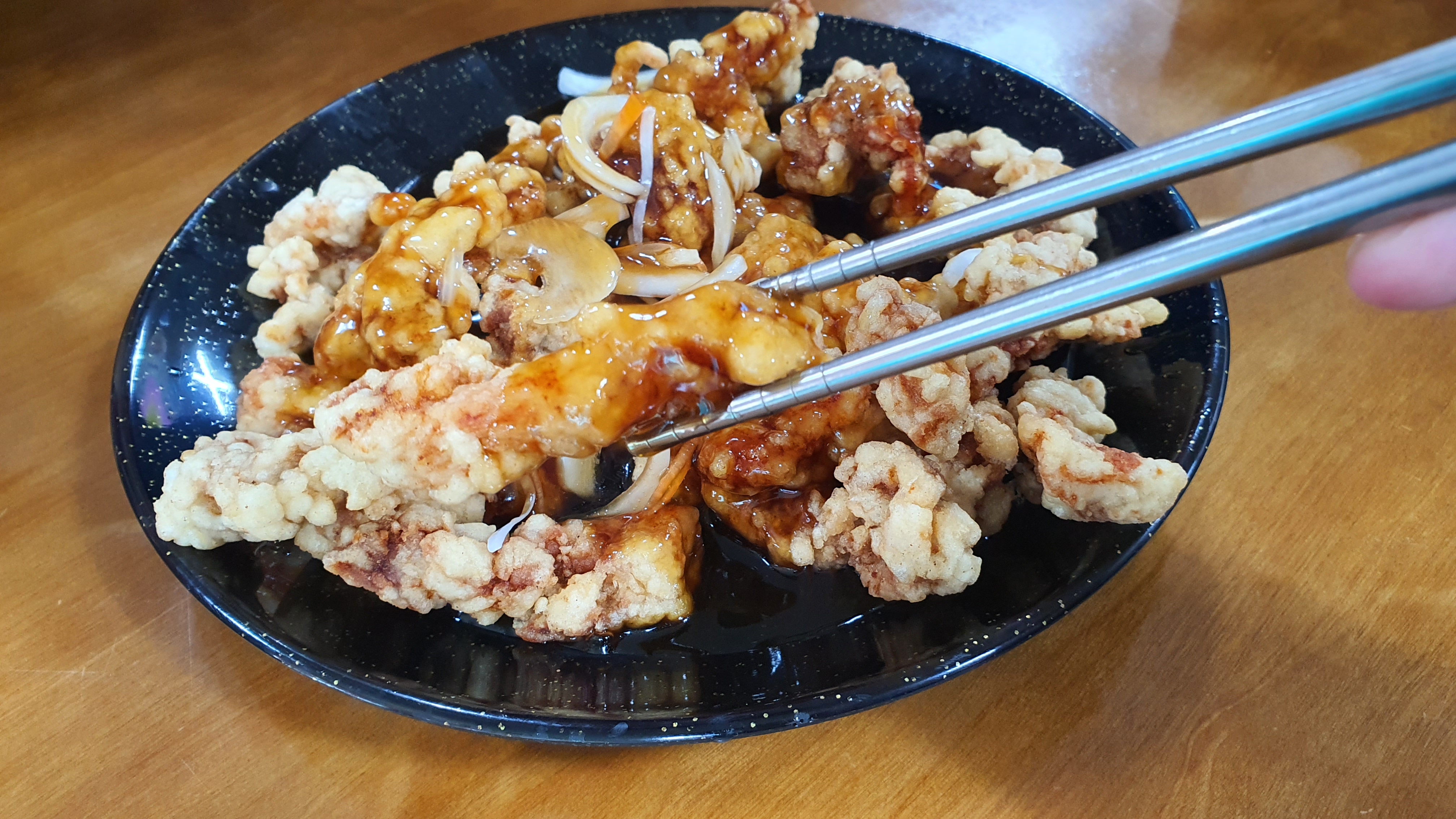 식당에서 특별한 돔베고기 튀김을 먹어보았다.
