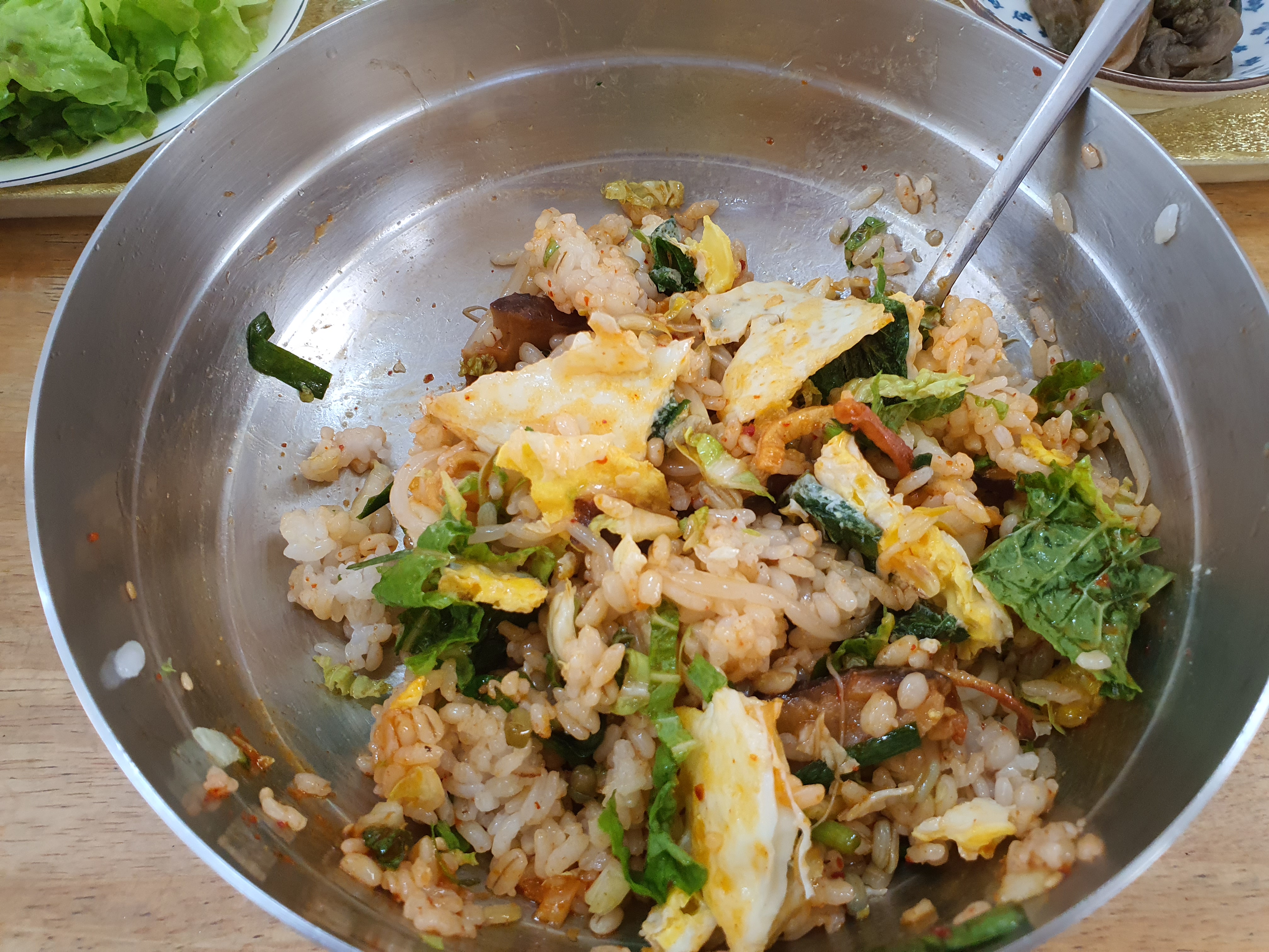 어느정도 취향에 맞게 쌈을 싸먹었다면, 이제는 이렇게 함께 비빔밥 처럼 먹을 수 있는데, 각종 반찬들과 시래기 무침과 계란까지 넣고 된장을 넣어주면 완벽한 보리비빔밥이된다.