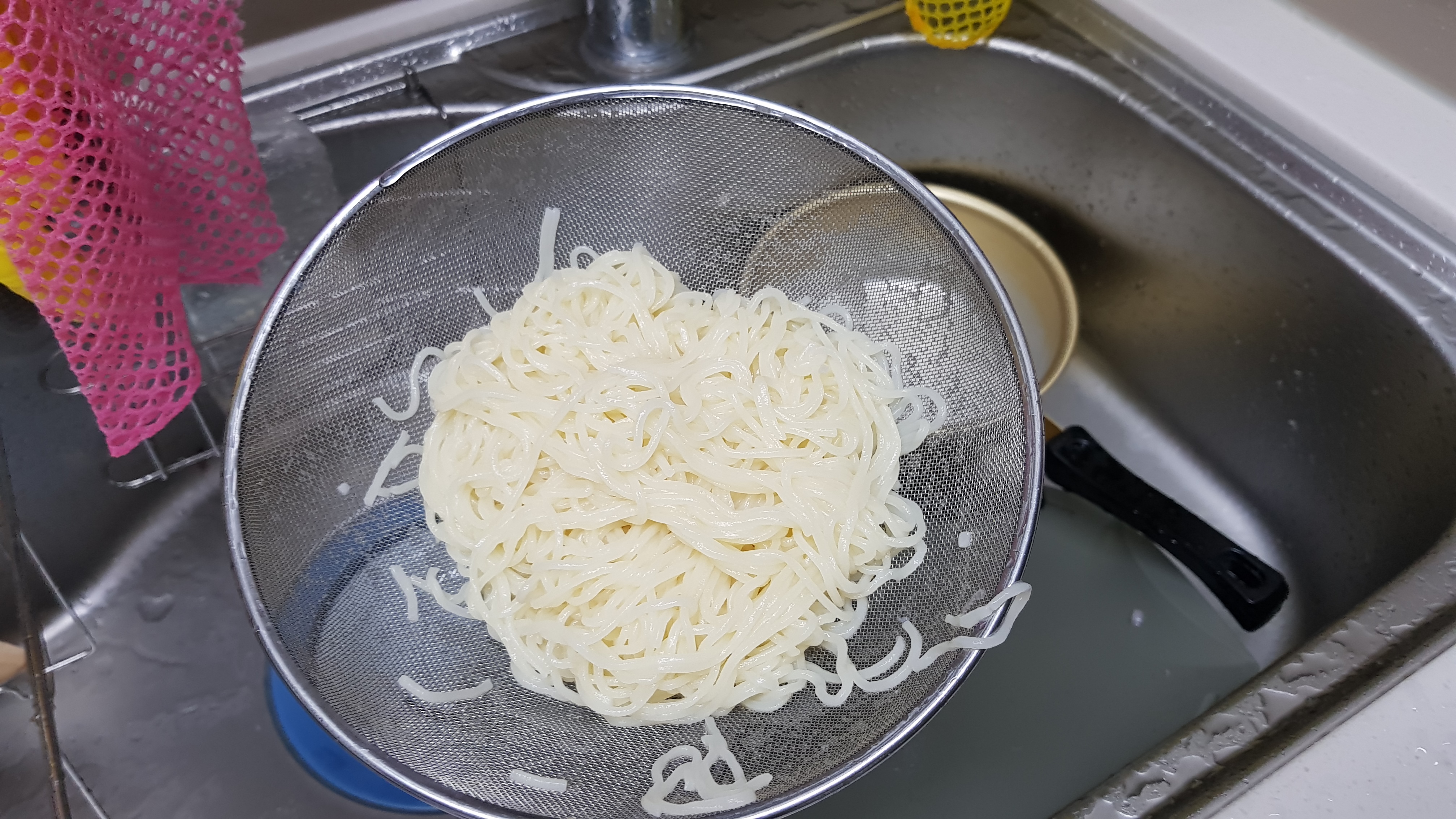 종이컵 9컵 반 냄비에 넣고 끓으면 소면을 넣고 3분간 삶은 후 찬물에 샤워 칙칙.