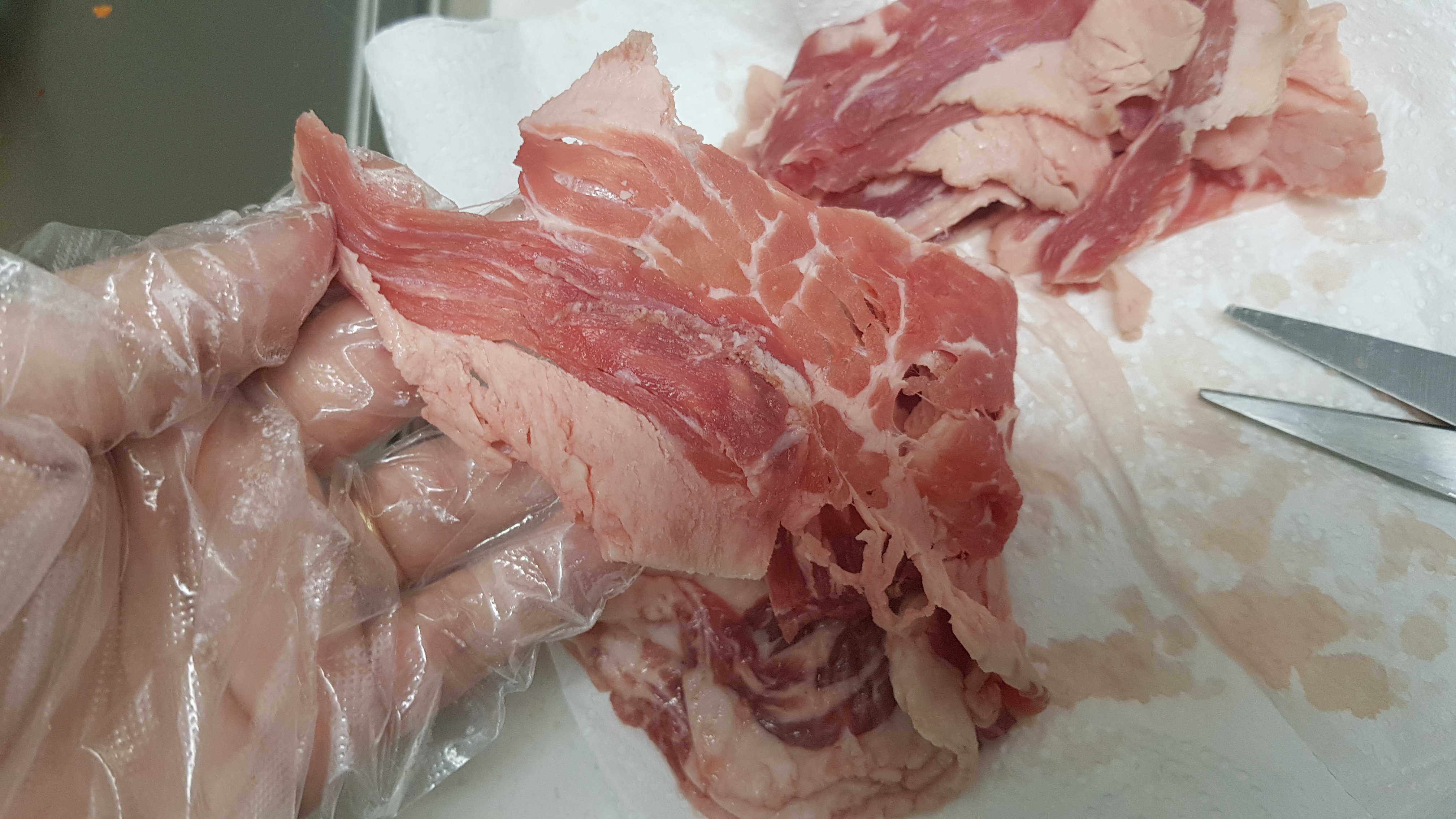 키친타올에 차돌박이 핏물을 제거한 뒤 먹기 좋게 자르기.