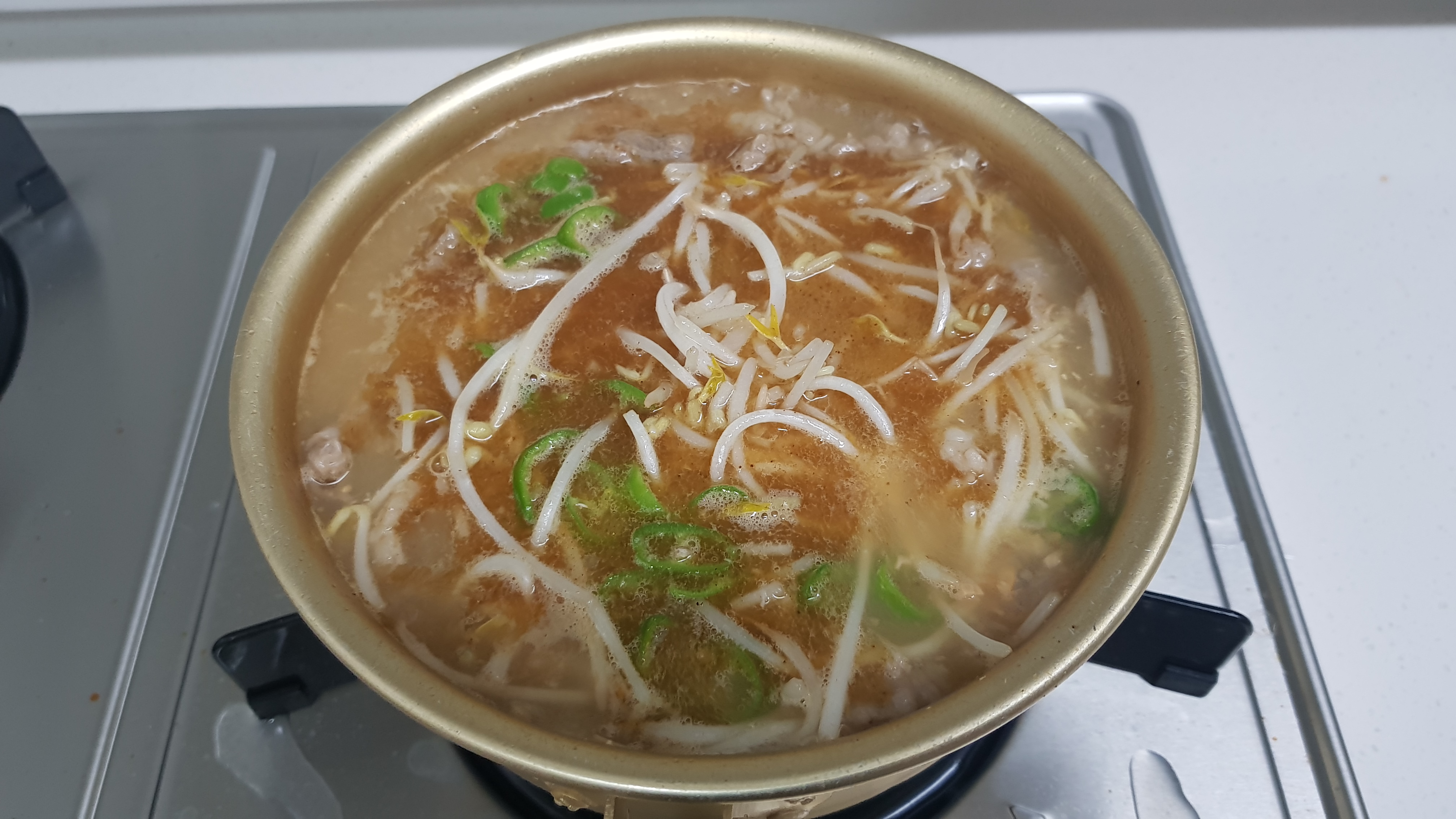 *청양고추, 숙주나물을 넣고 강불에서 3분간 끓인 후 그릇에 소면을 담고 육수를 부어 완성하기.