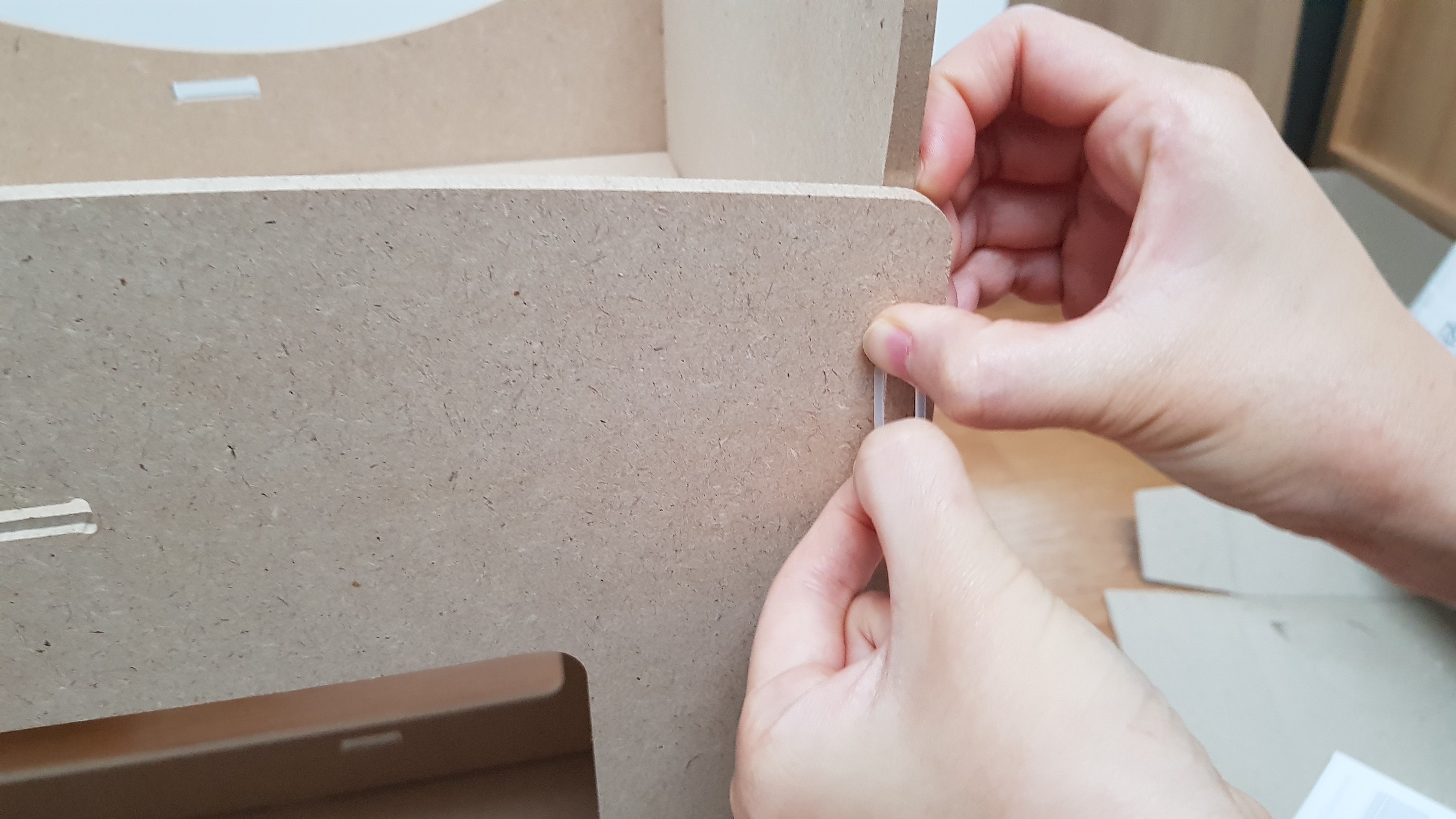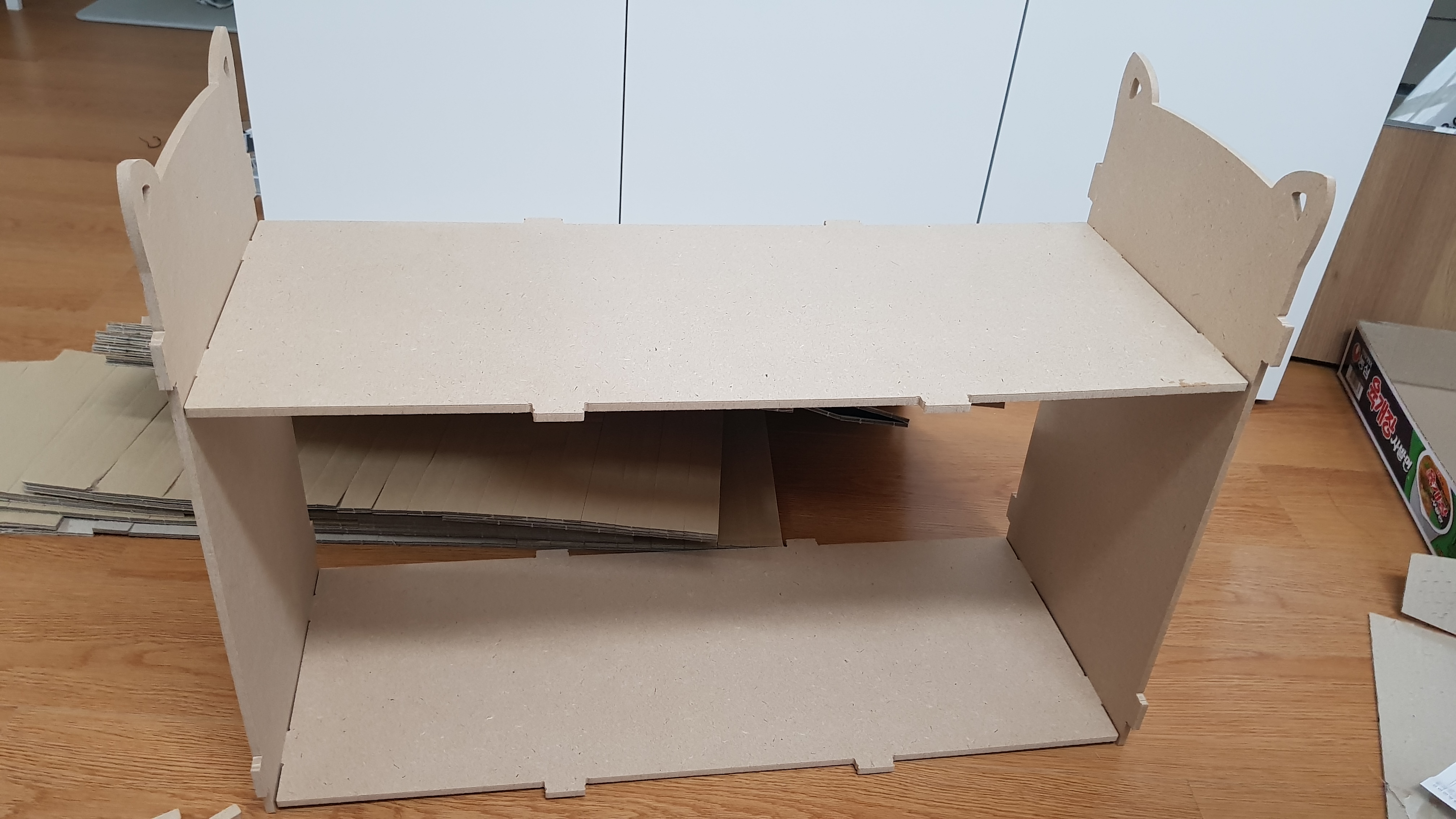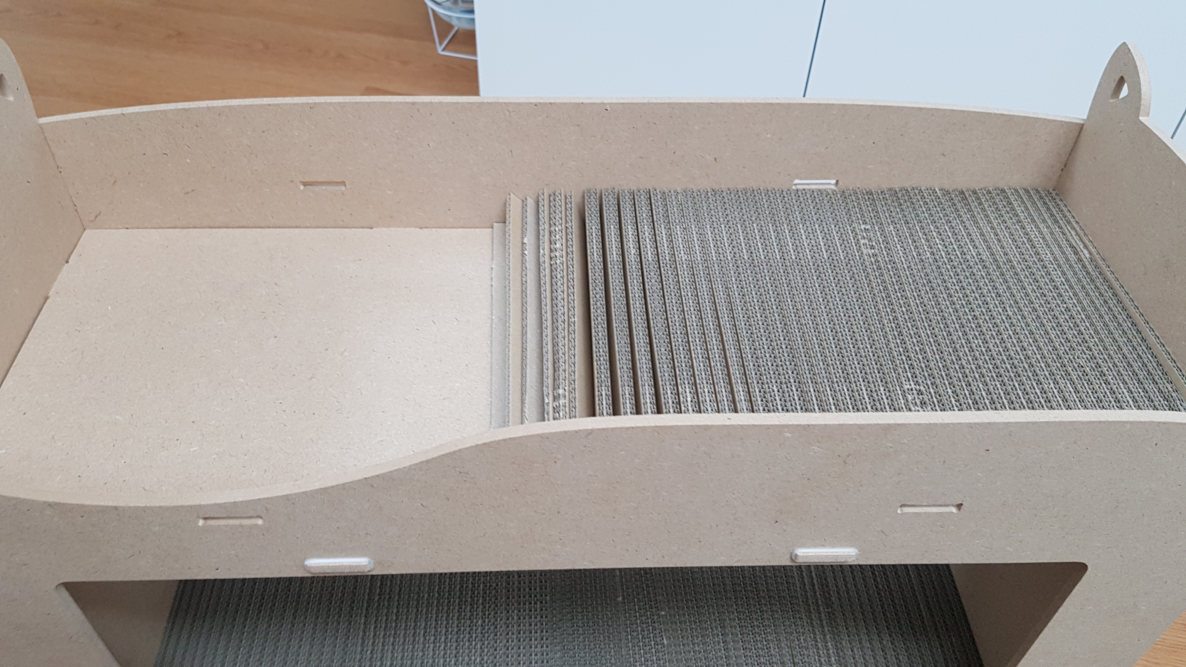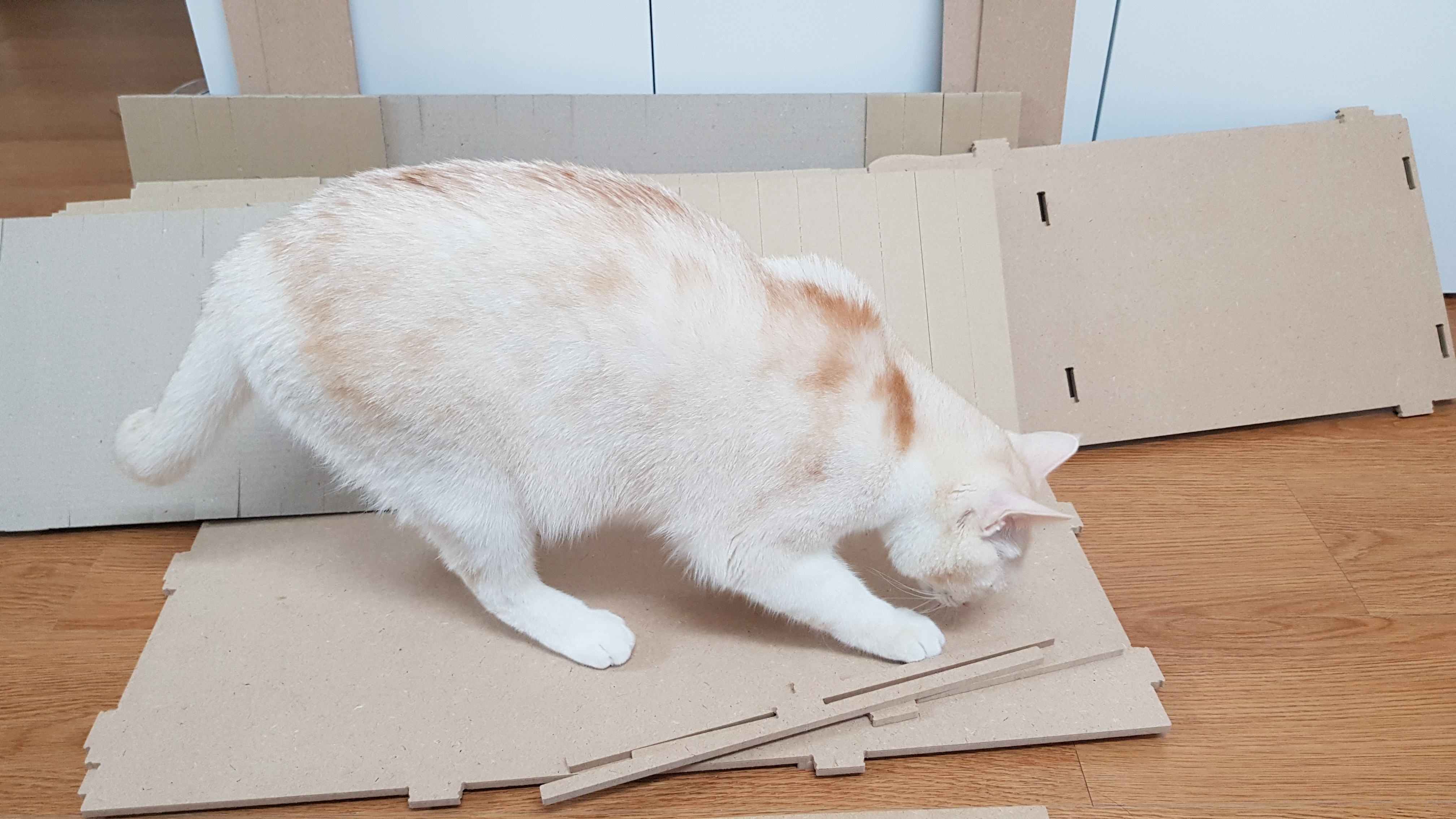 거의 완성이 되어가는 고양이 숨숨집에 막바지 작업은 바로 스크래쳐를 잘 접어서 끼우는 작업이에요.