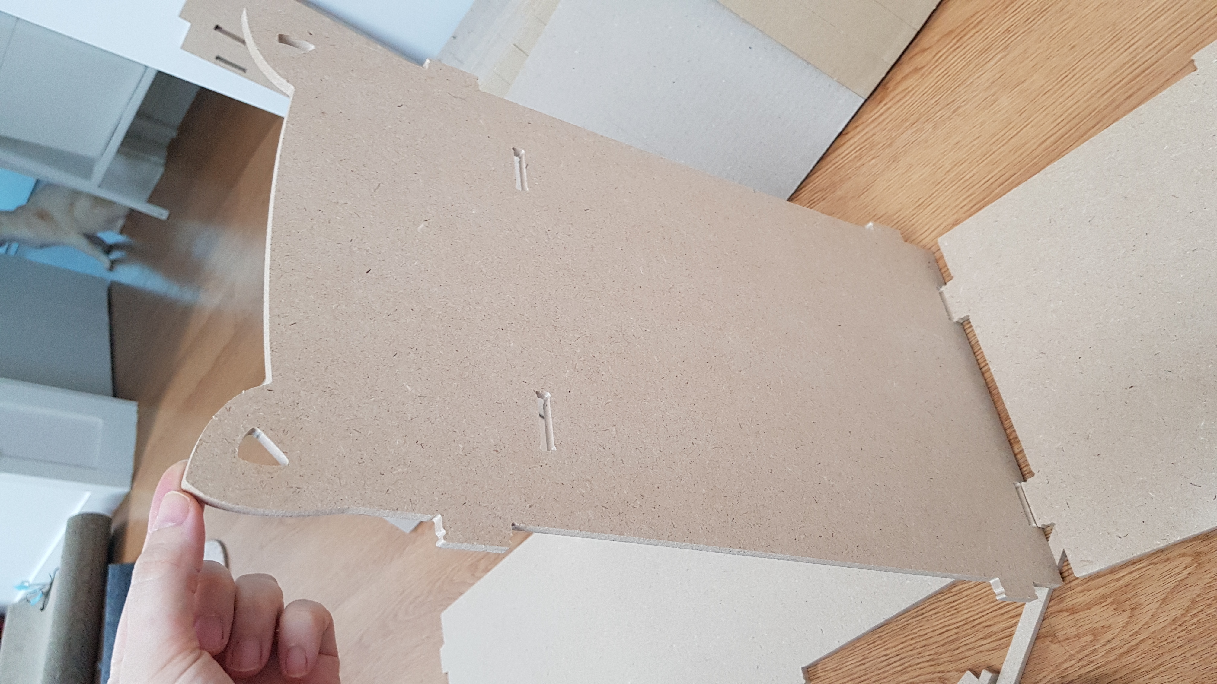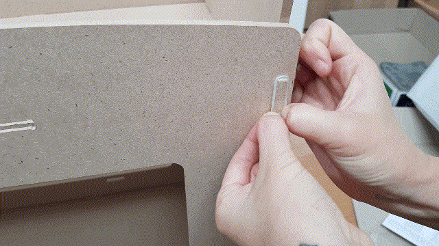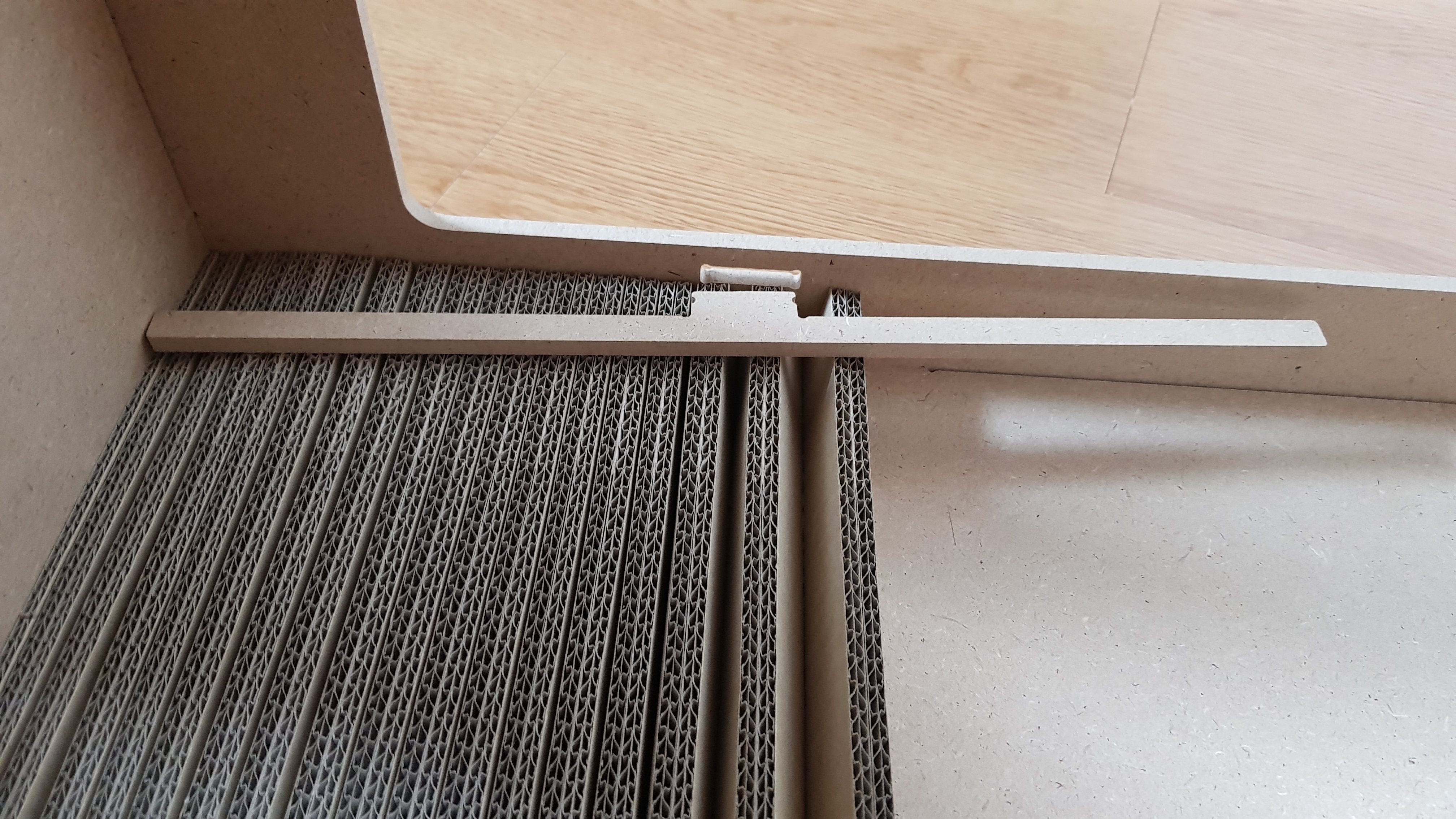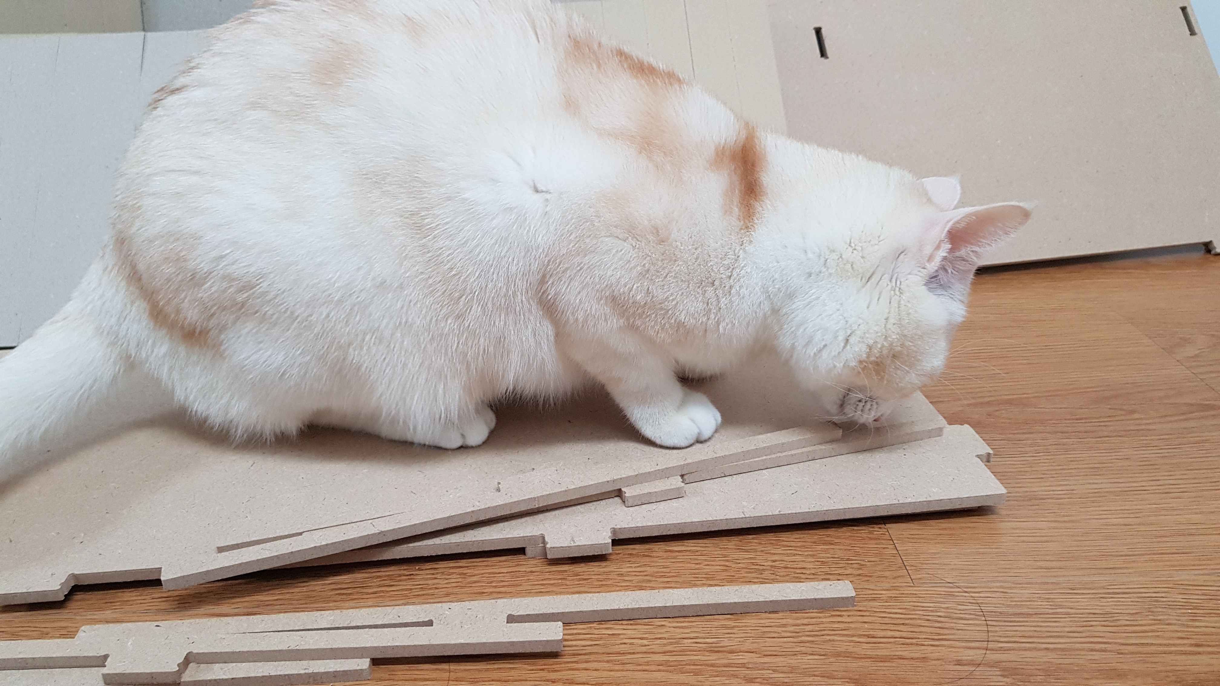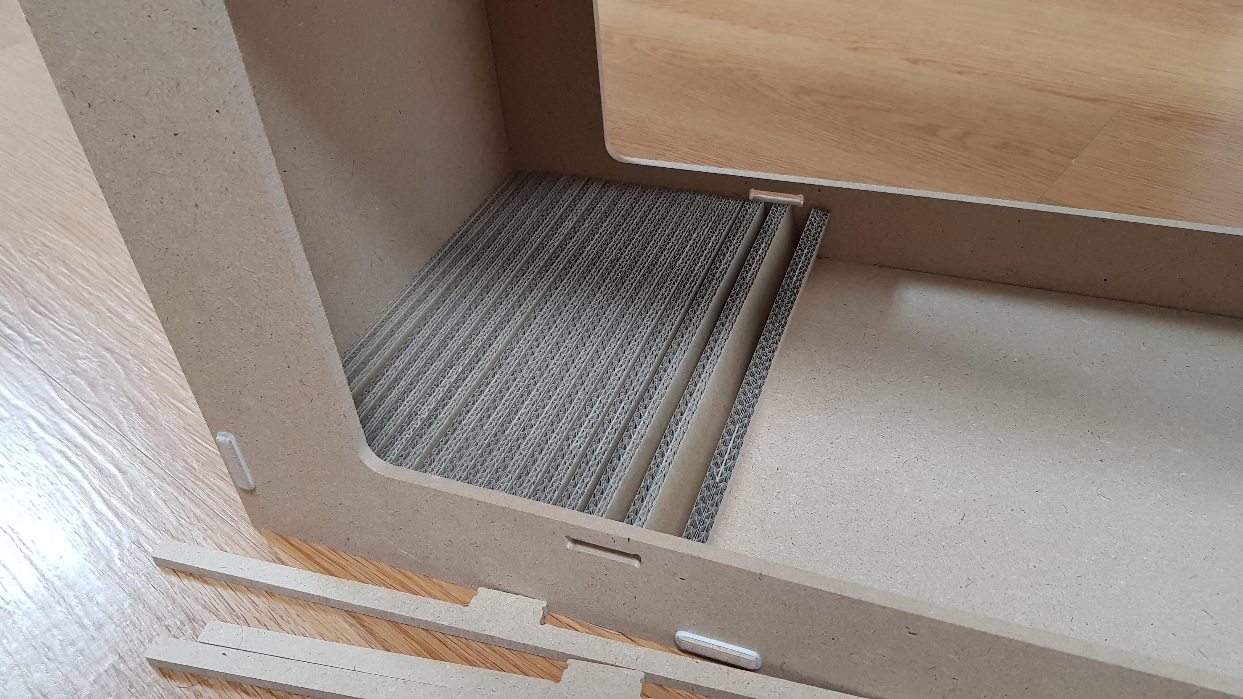 거의 완성이 되어가는 고양이 숨숨집에 막바지 작업은 바로 스크래쳐를 잘 접어서 끼우는 작업이에요.