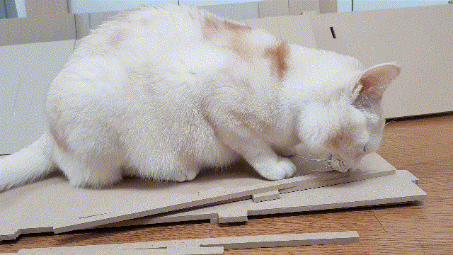 고양이 숨숨집 조립을 모두 마치니, 우리 고양이가 검사하러 왔어요.