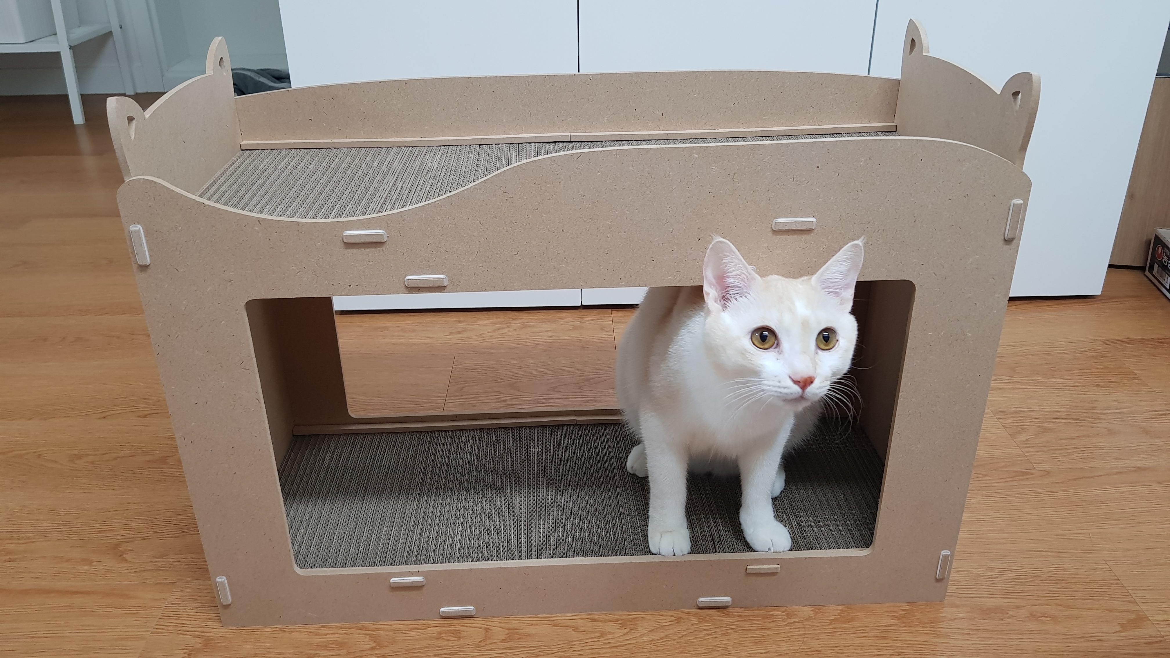 튼튼해서 좋고, 가루날림이 적어 더 좋고, 오랫동안 사용할 수 있어 좋고, 조립방법이 정말 쉬웠던 고양이 스크래쳐 겸 고양이 숨숨집입니다.