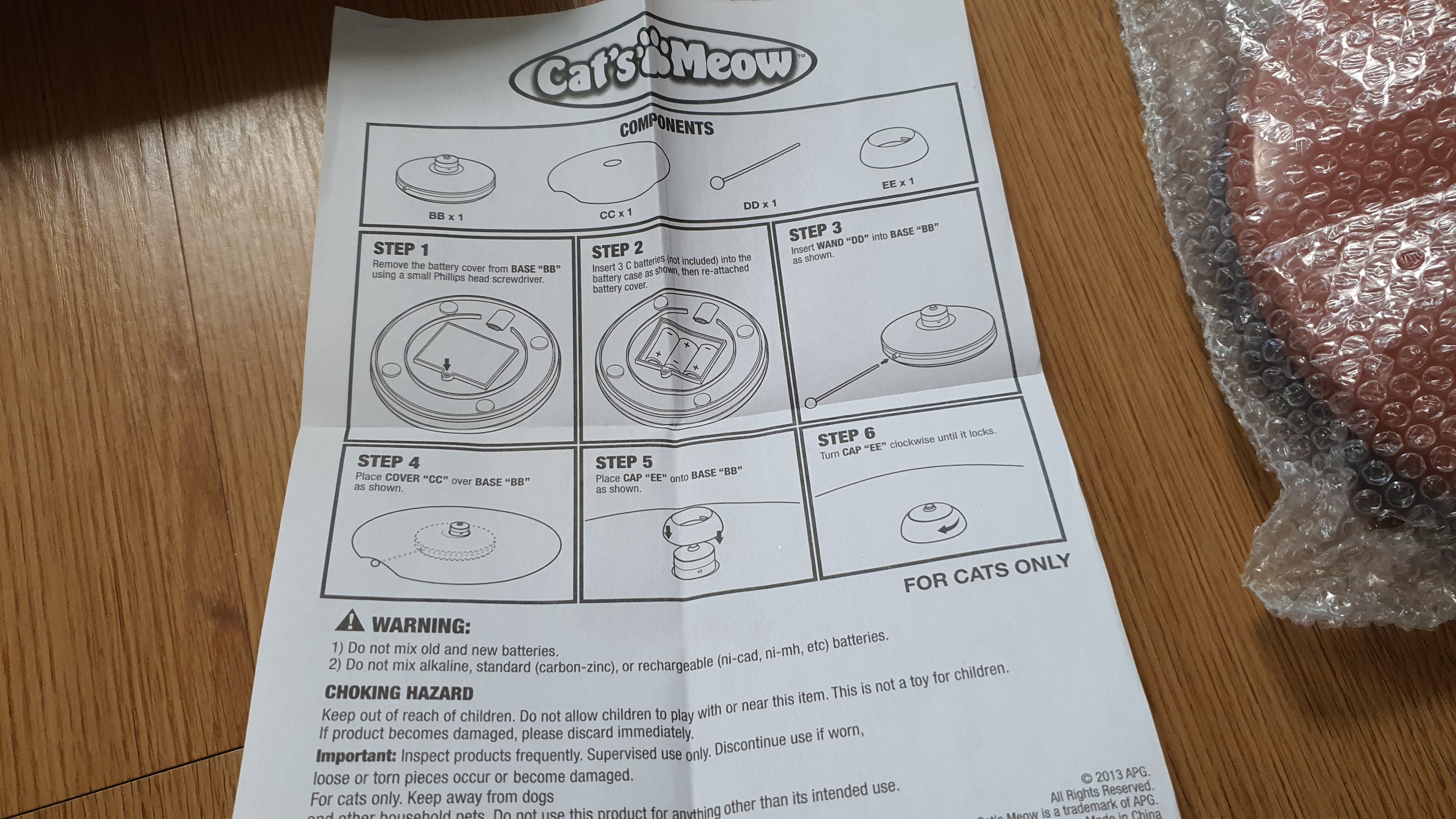 간단한 설명서가 들어있고 건전지를 넣은 후 빨간 고무꼬리?를 돌려서 끼우면 고양이 장난감 조립은 끝이다.