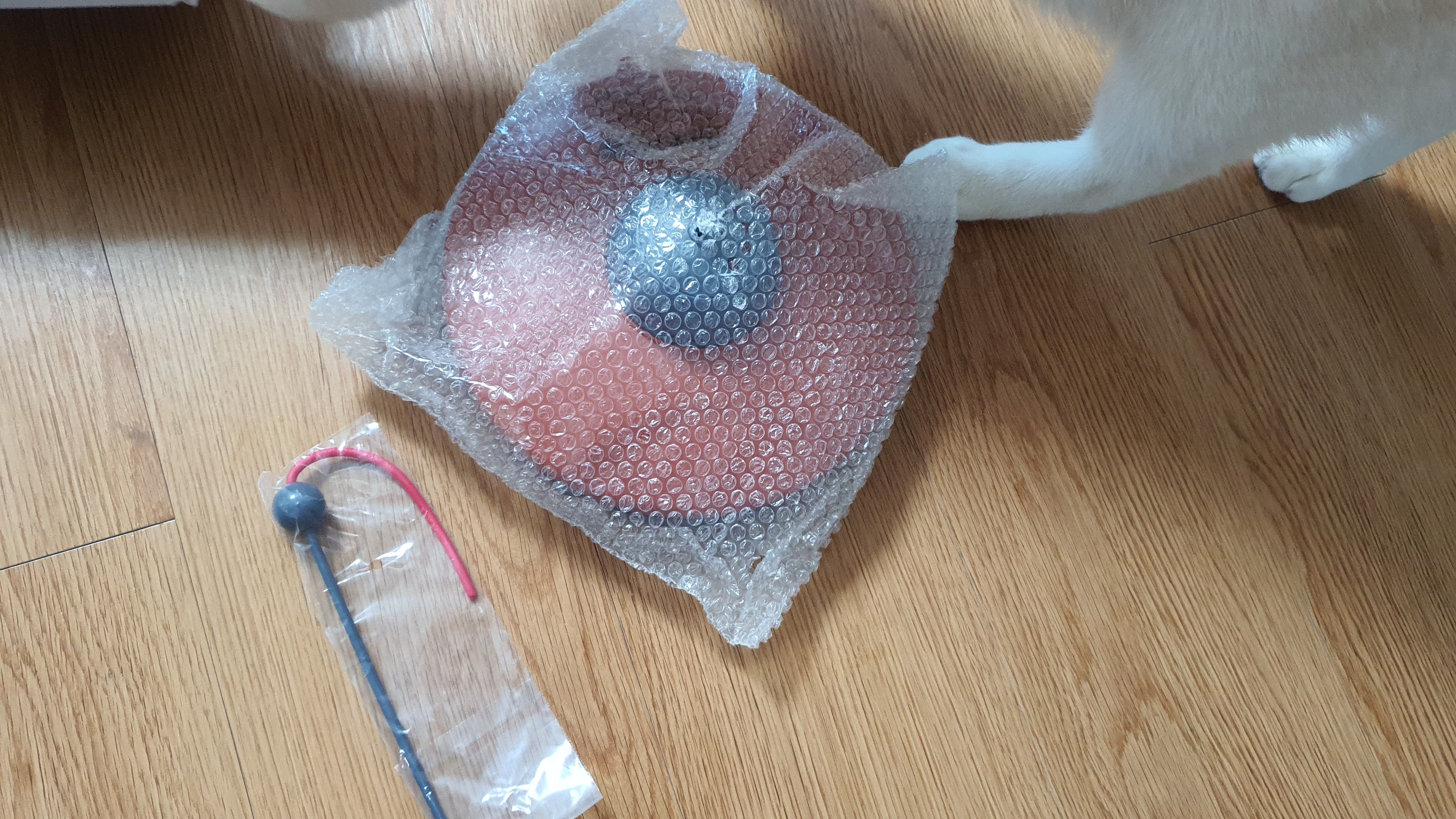 플라스틱 제품이기 때문에 뽁뽁이로 한번 더 포장이 되어있고 꺼내자 마자 고양이가 냄새 맡으러 출동한다.