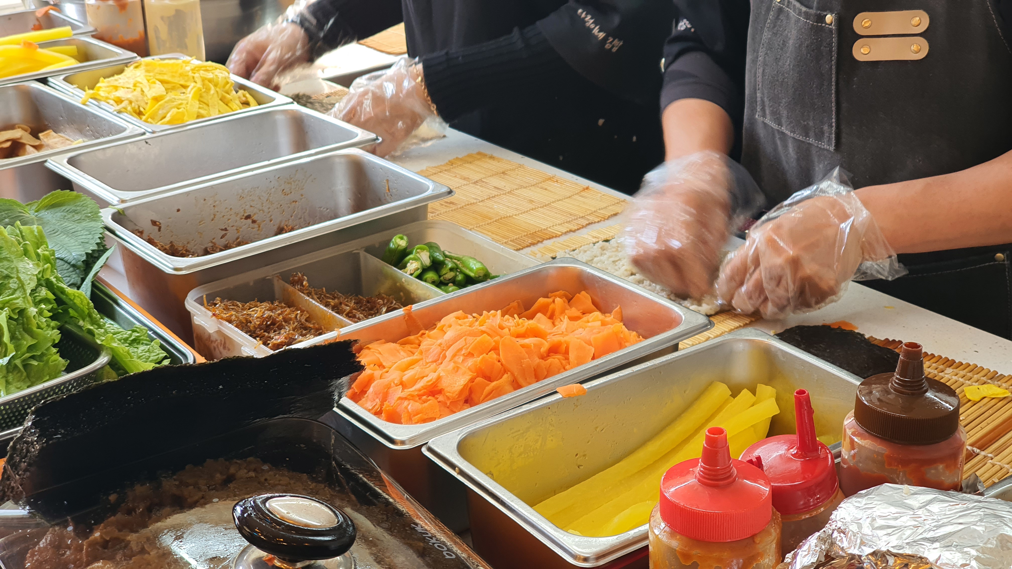 미리 만들어놓은 김밥이 아니라, 주문 즉시 바로 앞에서 만들어 주는데 손놀림이 예사롭지 않아요.