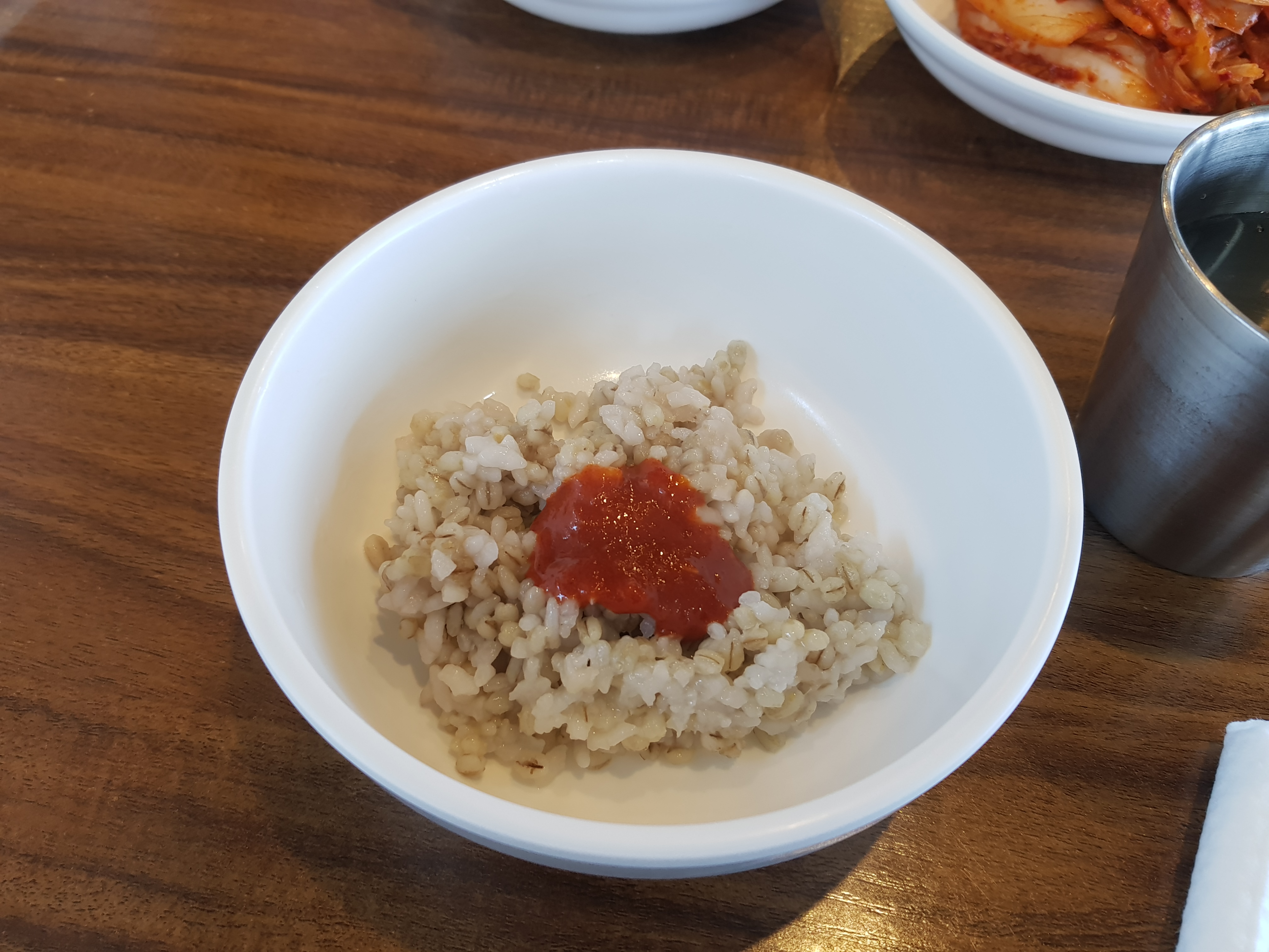 서귀포 현지인 맛집에서 칼국수가 나오기 전에 보리밥이 제공되는데, 고추장?소스가 살짝 부려진 보리밥이다.