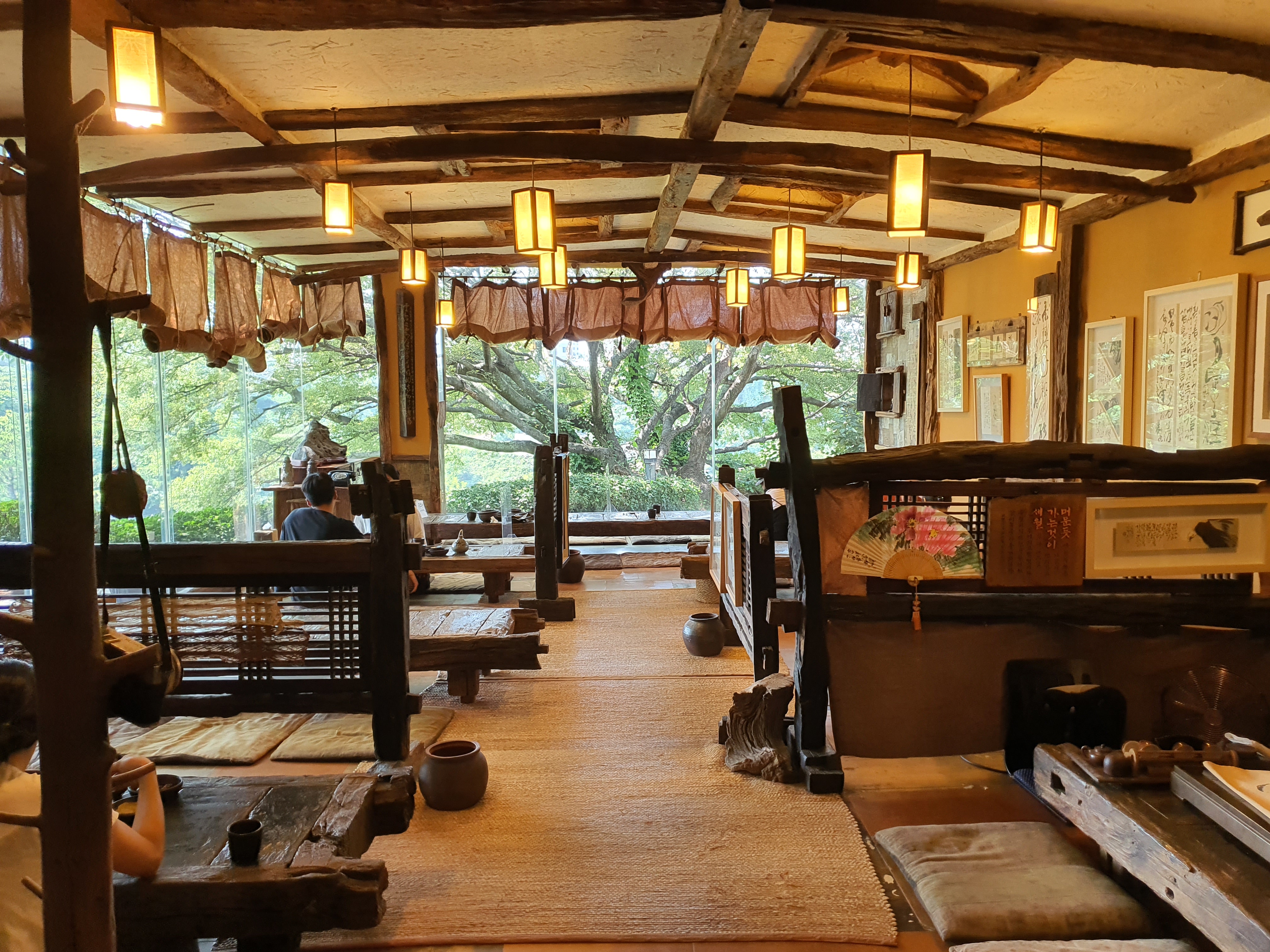 야외를 볼 수 있는 테이블과 방안에도 테이블이 있는데, 벽면에는 아름다운 한자가 쓰여있는 액자들과 전통스러운 소품들이 가득하다.