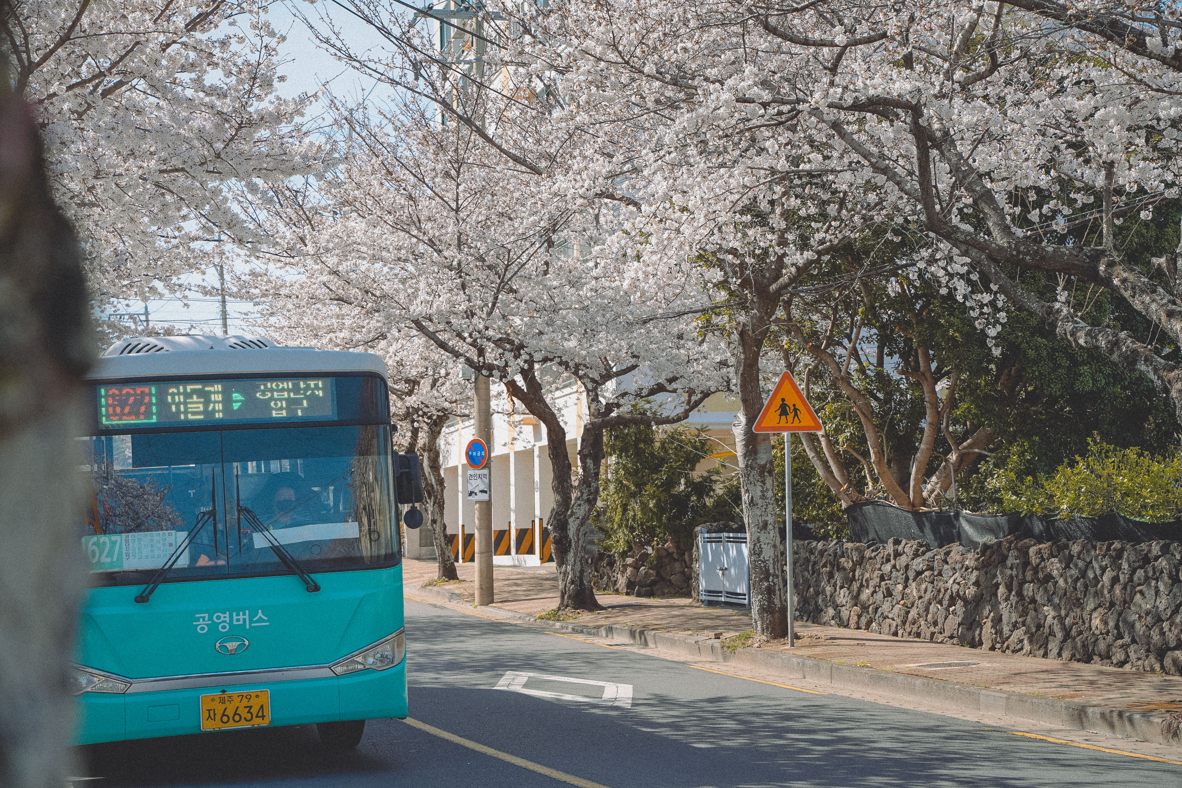 벚꽃과 함께 찍은 예쁜 제주버스도 많이 다니구요.
