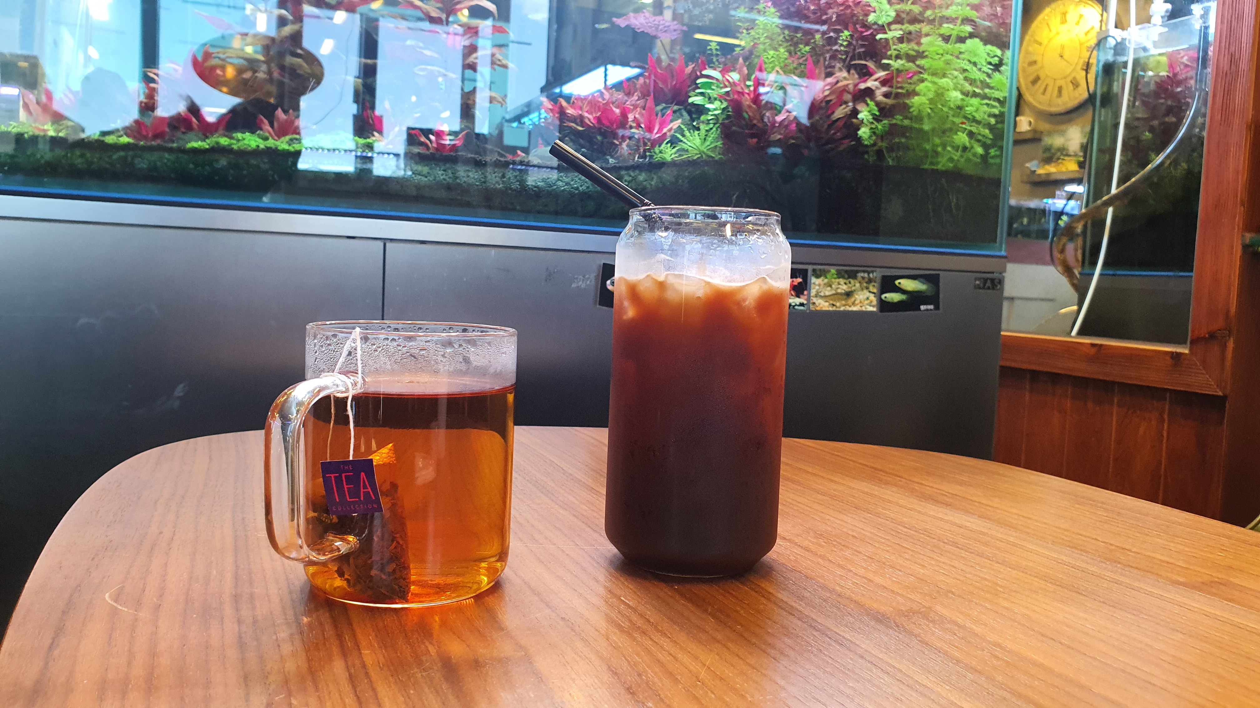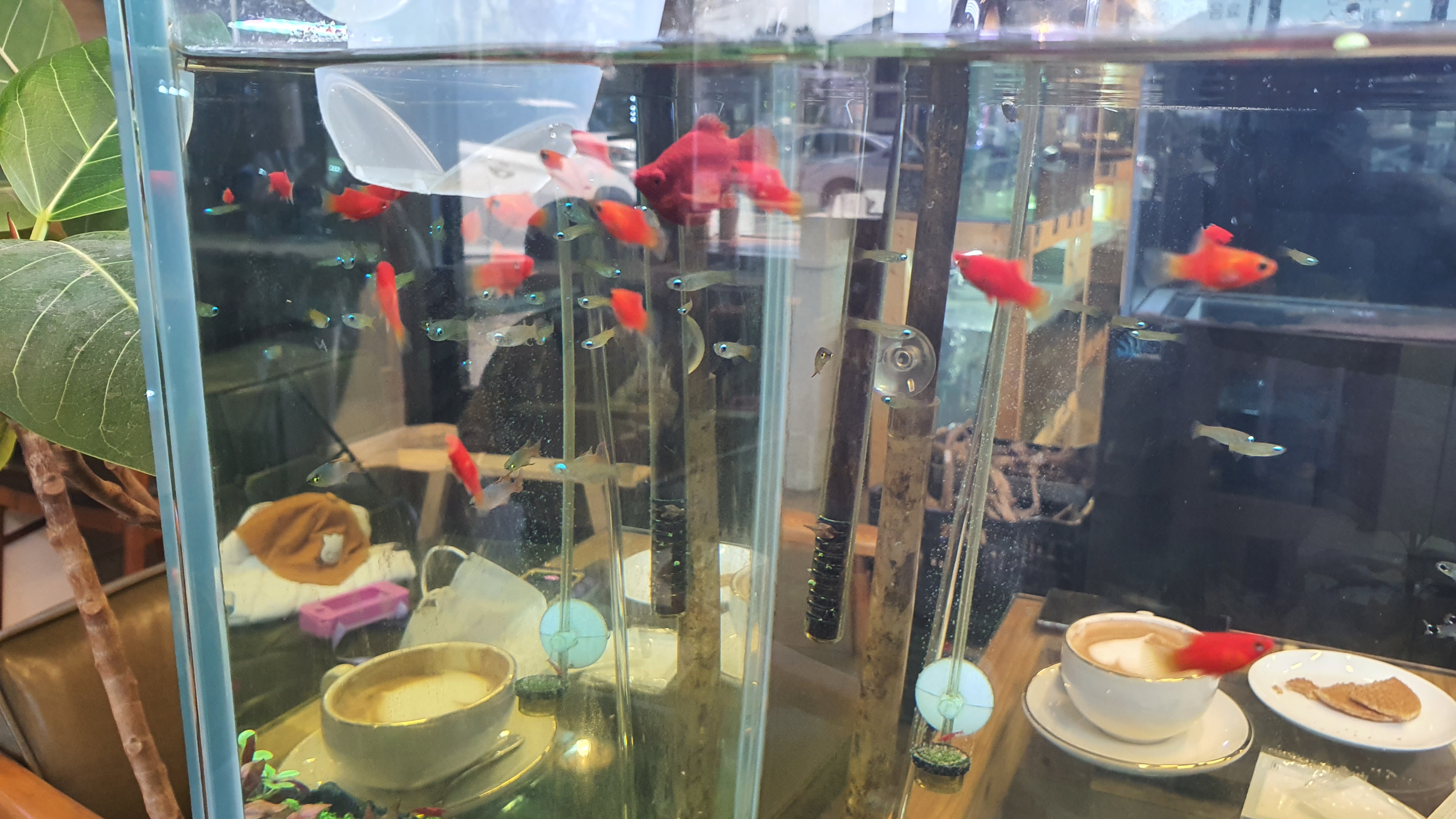 다양한 물고기가 한 수조에서 이리저리 왔다가 갔다 하는 모습을 커피를 마시며 구경할 수 있다.