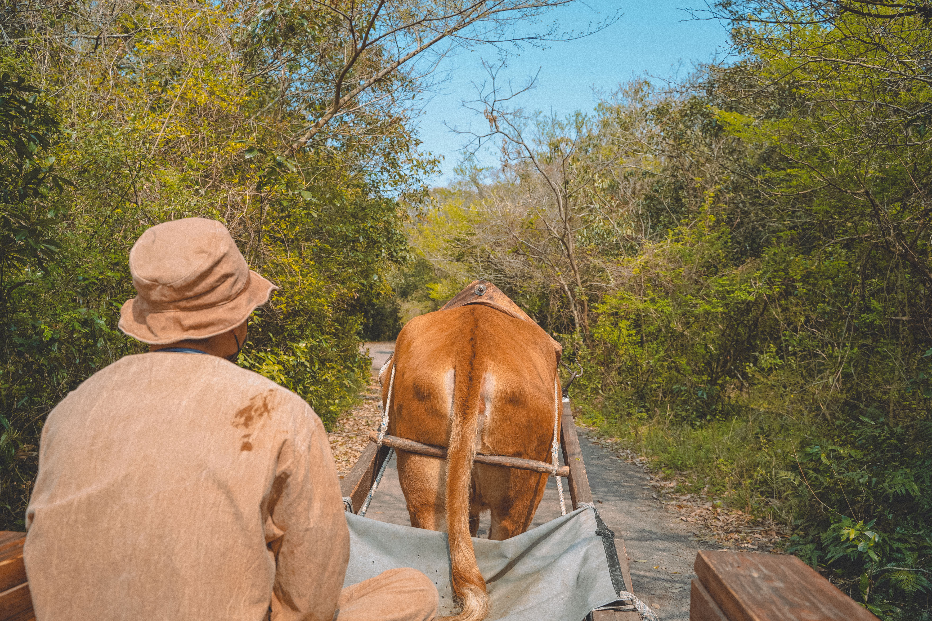 이색적인 제주도 여행 산양큰엉곶 숲길에서 멀리 달구지를 끌고 지나가는 소도 볼 수 있어요.