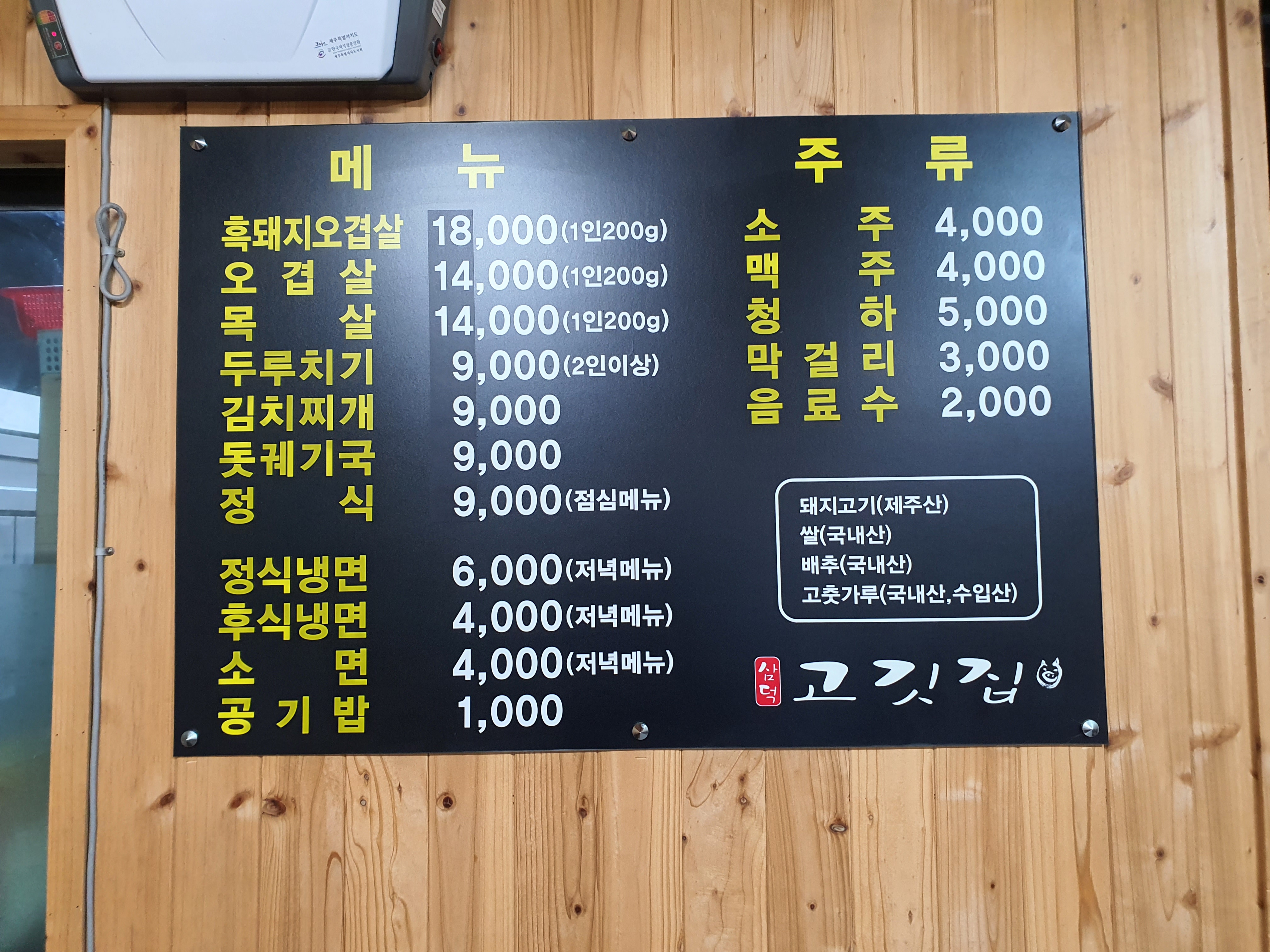 제주 남원 맛집 삼덕고깃집도 금액 조금올랐는데, 흑돼지 오겹살 1,800원 / 두루치기 9,000원(2인이상)