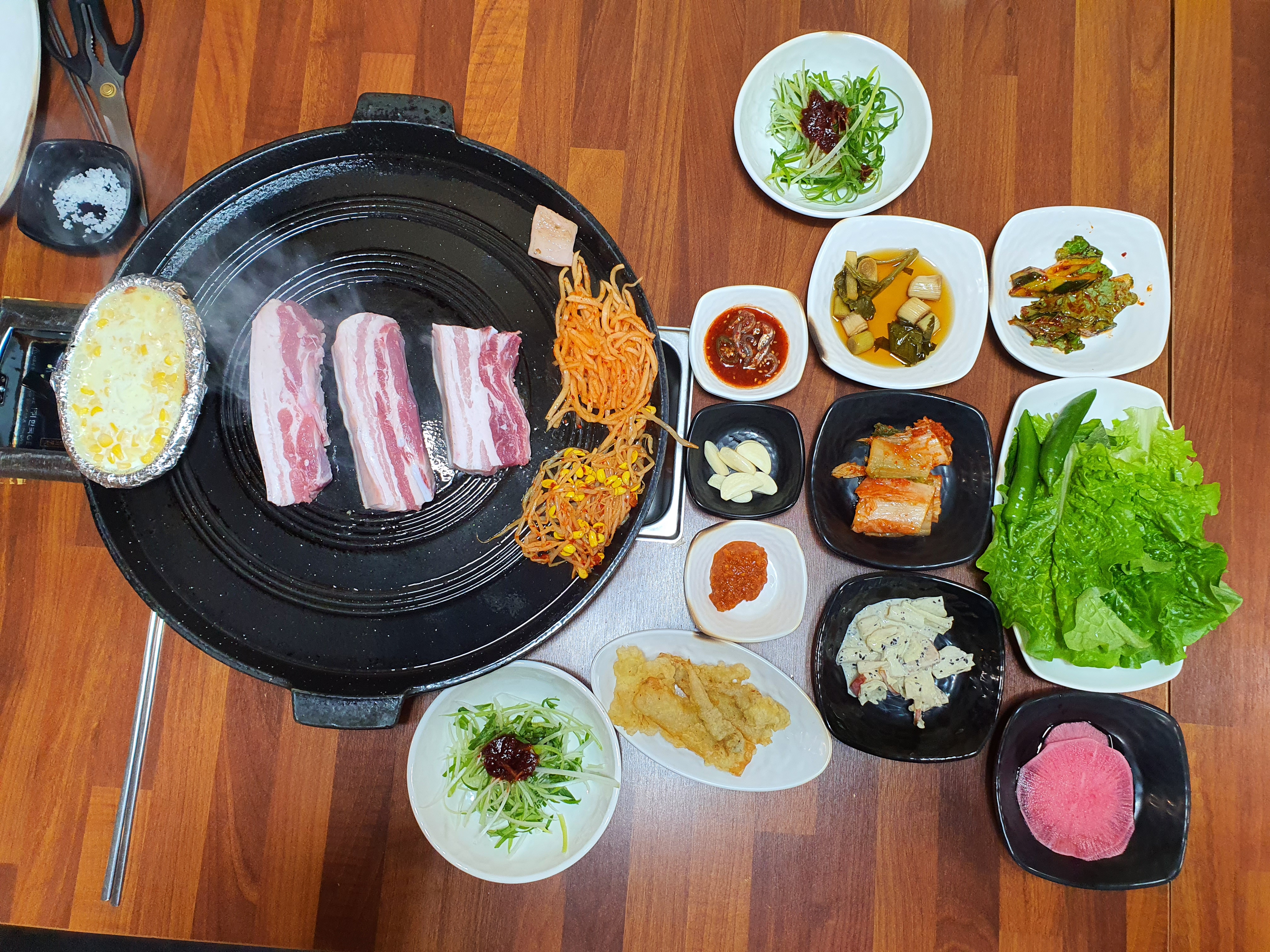 불판이 솥뚜껑이라 생각보다 열이 빠르게 올라오고, 굉장히 고기가 맛있게 익더라구요.