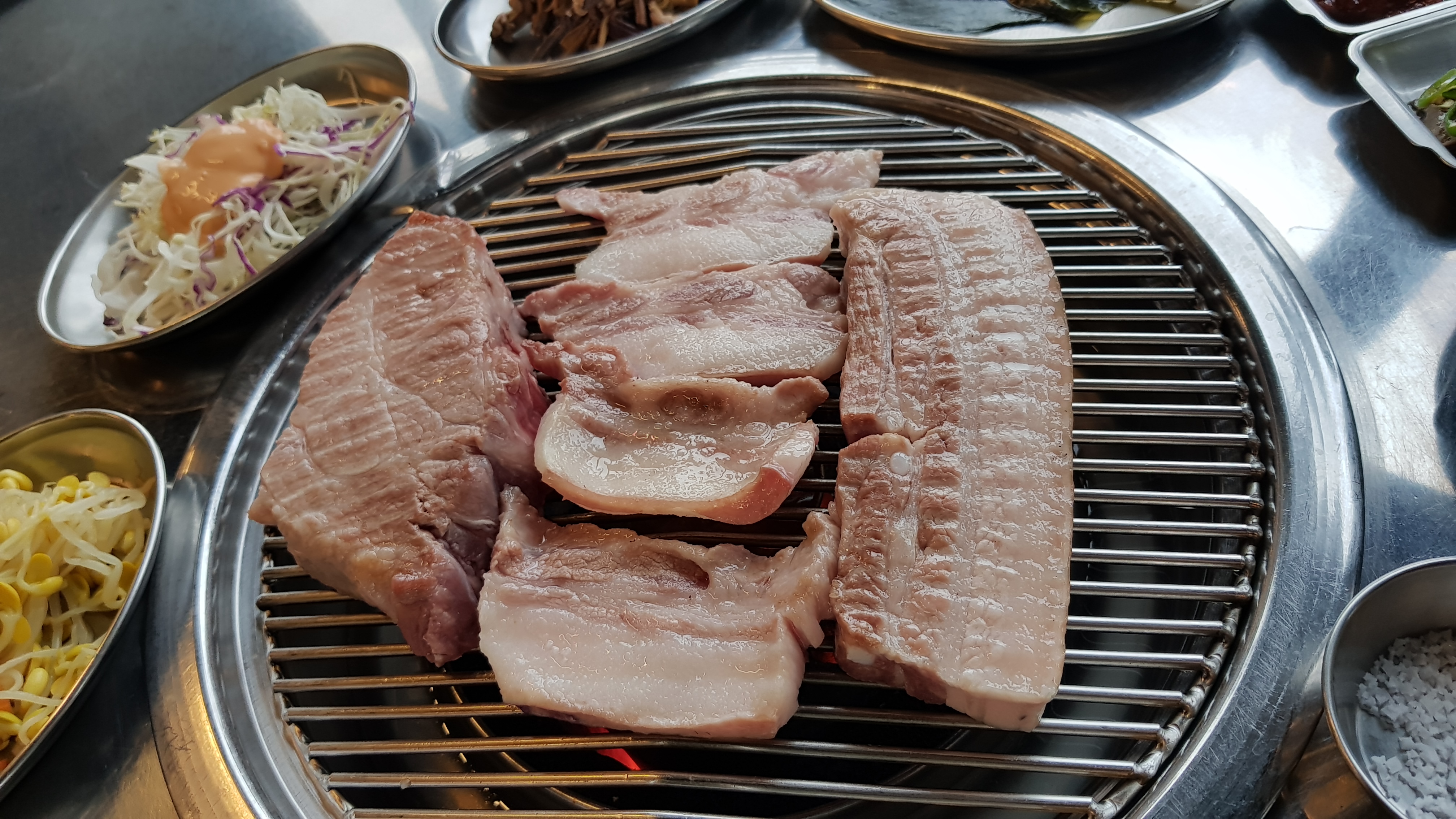 이곳은 숯불이 아닌, 솥뚜껑같은 불판에 고기를 구워먹는 곳이에요.